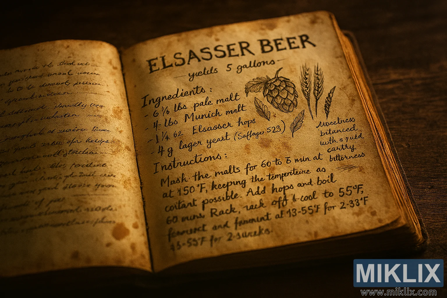 Hierdie hoëresolusie-landskapbeeld vang 'n ryk atmosferiese stillewe vas wat gesentreer is op 'n oop, handgeskrewe resepteboek gewy aan tradisionele Elsaesser-bierbroutegnieke. Die boek rus op 'n donker houtoppervlak met sigbare horisontale greinpatrone, wat diepte en rustieke sjarme aan die komposisie gee. Die bladsye van die boek is verouderd en getekstureerd - vergeel met tyd, gevlek met gebruik, en besaai met bruin kolle wat dui op jare se praktiese brouery.