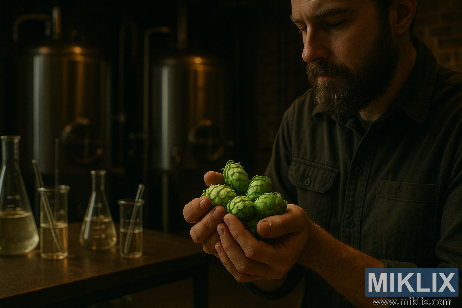In 'n dowwe ambagsbrouhuis inspekteer 'n brouer Pacific Jade-hop te midde van laboratoriumgereedskap en vlekvrye tenks, en beklemtoon hul rol in unieke bierresepte.