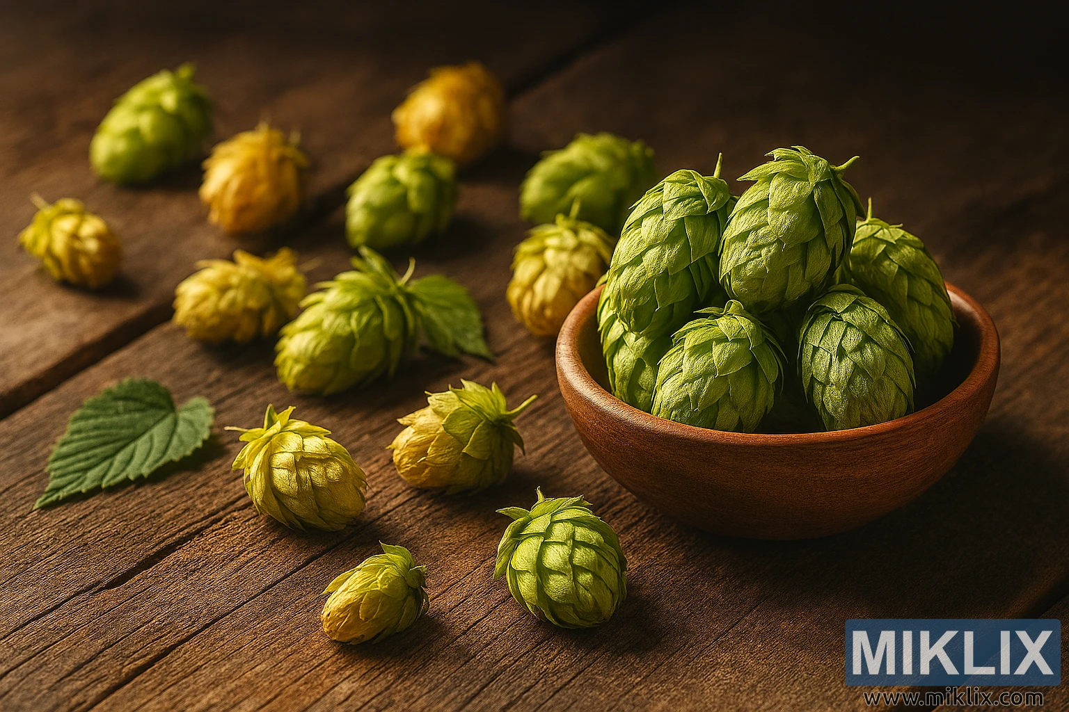 Sovereign Hop Cones on Rustic Table – High-Resolution Brewing Ingredient Image