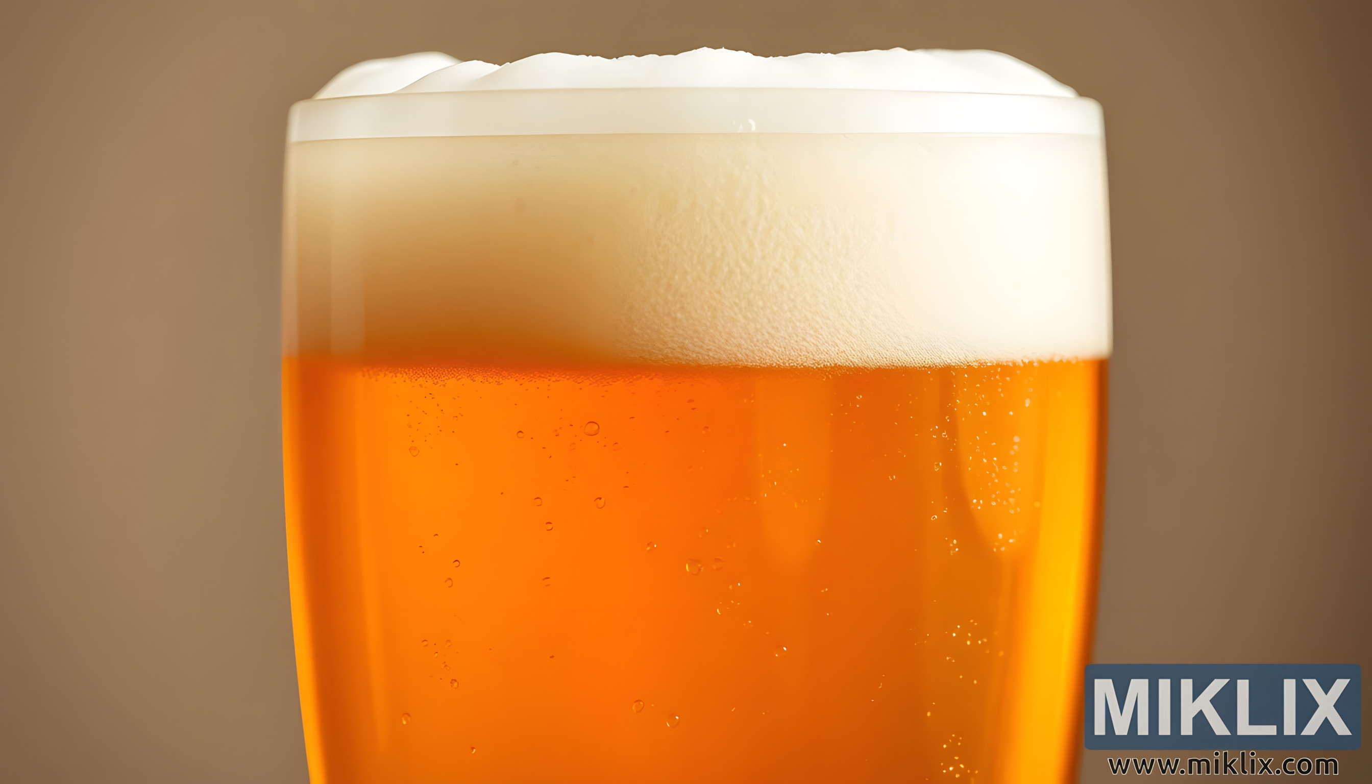 Vars geskinkte goue bier met 'n dik romerige skuimkop, warm beligting en moutgedrewe aromas, wat helderheid, bruising en bekwame broukuns ten toon stel.