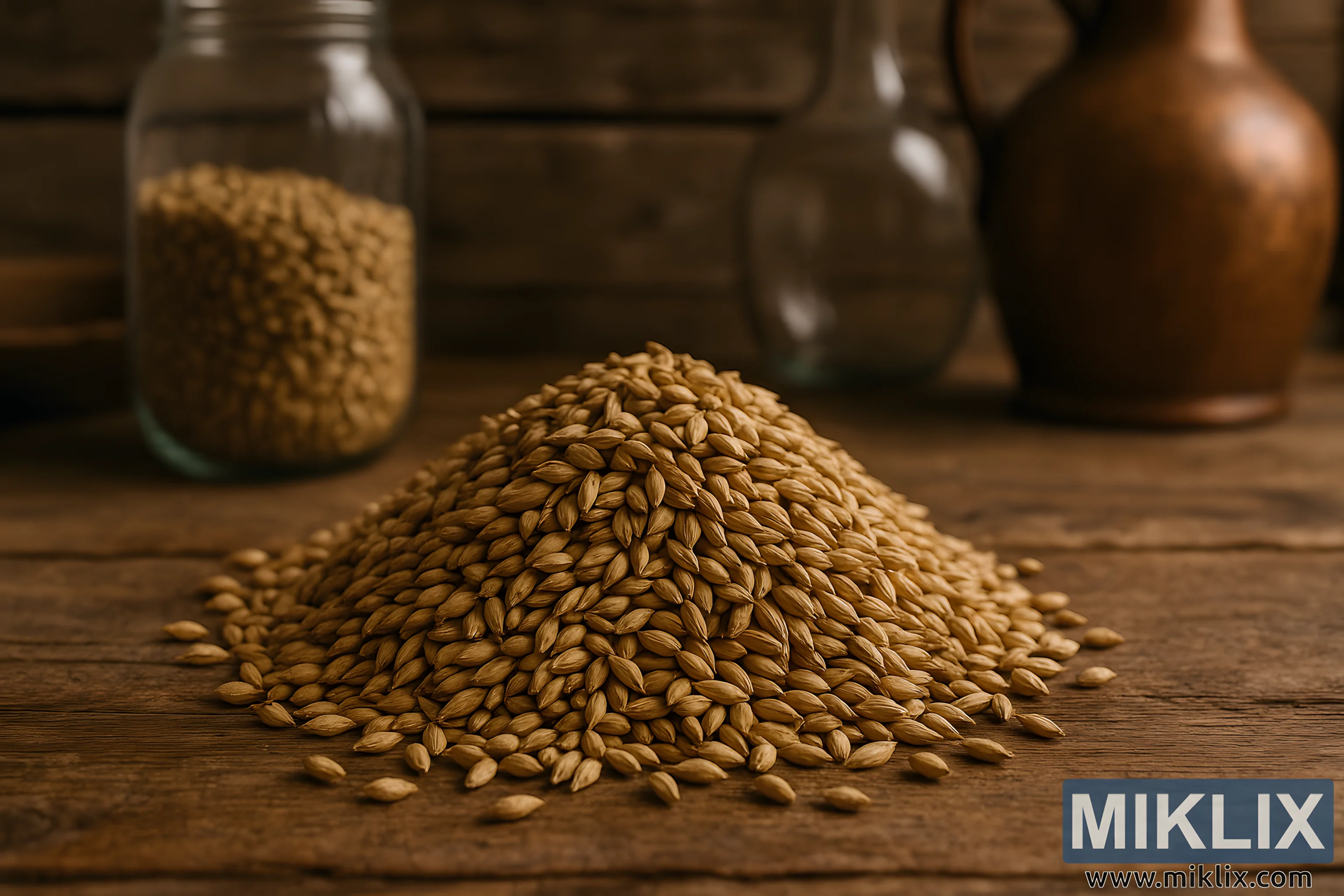 Die beeld bied 'n nabyskoot, landskap-georiënteerde foto van 'n klein hoopie bleek ale-mout wat op 'n rustieke houttafel rus, wat die atmosfeer van 'n tradisionele tuisbrou-omgewing oproep. Die moutkorrels vorm 'n kompakte, liggies skuins hoop in die middel van die raam, met individuele pitte duidelik sigbaar. Elke korrel toon subtiele variasies in vorm en grootte, verleng en effens geboë, met die doppe ongeskonde. Hul kleur wissel van ligte goue strooi tot warm amber, wat dui op versigtige oondmaak tipies van bleek ale-mout. Die skerp fokus onthul fyn oppervlakteksture, dowwe rante en natuurlike onvolmaakthede wat die organiese kwaliteit van die graan beklemtoon.