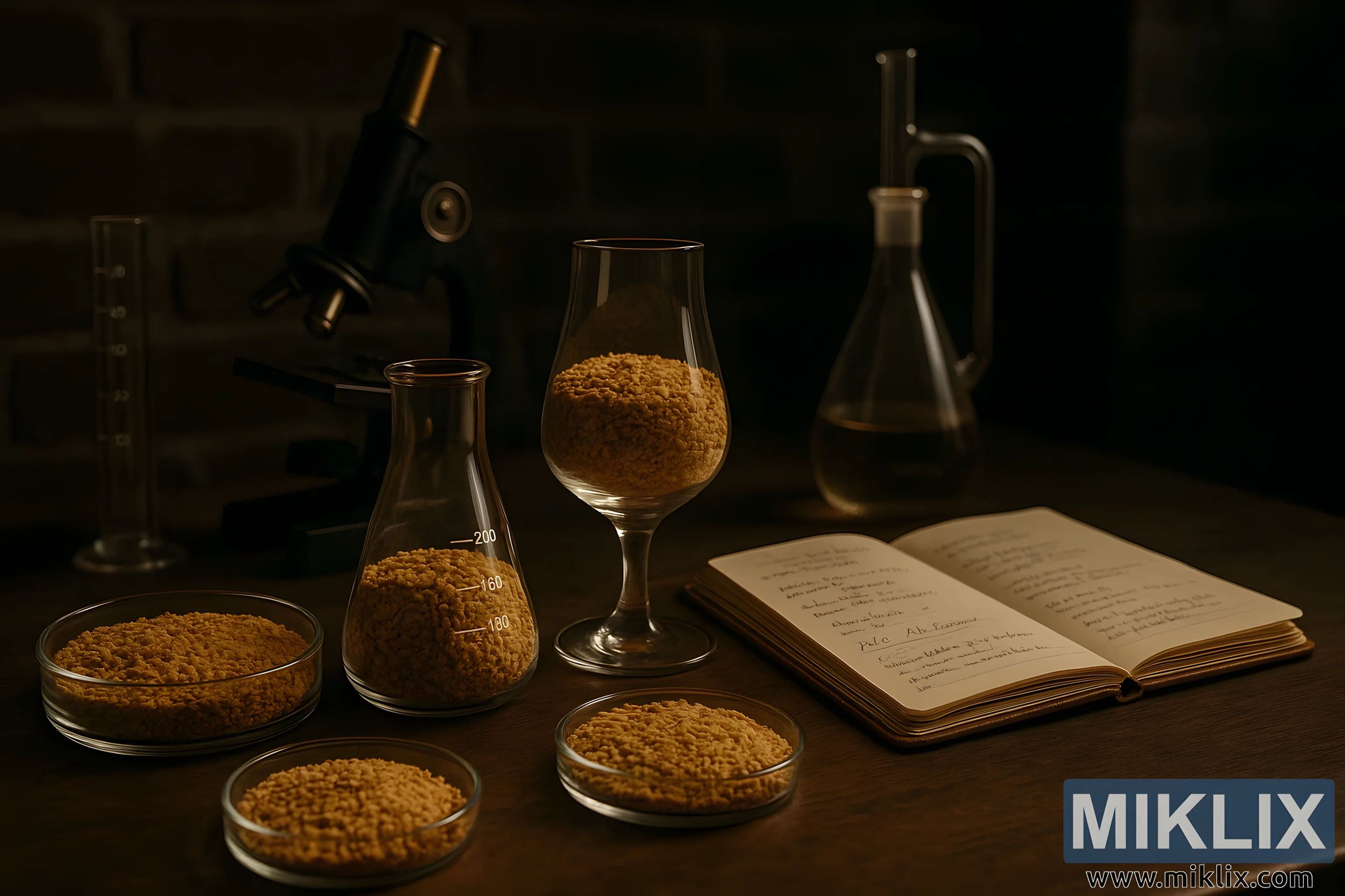 Die beligting is doelbewus en intiem, en werp sagte skaduwees wat die kontoere van die glasware en die korrels binne beklemtoon. Dit skep 'n gevoel van fokus en kalmte, wat die oog na die subtiele variasies in kleur en vorm tussen die moutmonsters trek. 'n Wynglas gevul met dieselfde korrelrige stof voeg 'n tikkie grilligheid en elegansie by, wat dui op die sensoriese plesiere wat voorlê in die brouproses. Naby staan 'n mikroskoop gereed, en die teenwoordigheid daarvan dui daarop dat dit nie net 'n ruimte vir meng en meet is nie, maar vir noukeurige waarneming en kritiese evaluering. Die teenstelling van wetenskaplike instrumente met ambagsmanlike bestanddele onderstreep die dubbele aard van brou - gelyke dele chemie en kreatiwiteit.