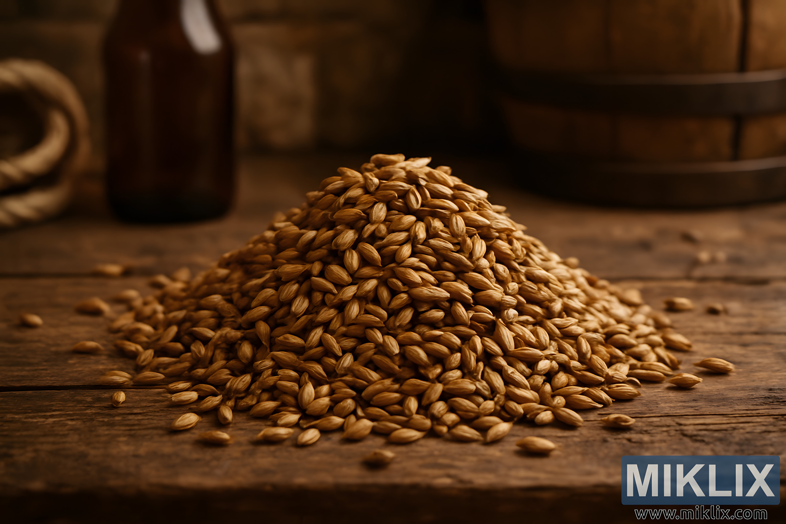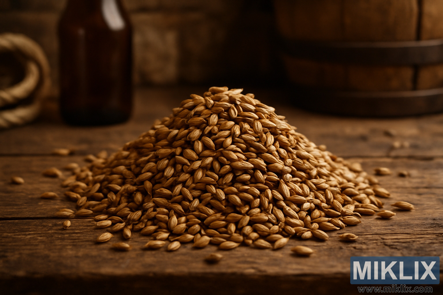 Die beeld bied 'n naby-opname, landskap-georiënteerde aansig van 'n klein hopie koringmout wat op 'n rustieke houttafel rus in 'n tuisbrou-geïnspireerde omgewing. In die middel van die komposisie is 'n hoop gemoute koringkorrels, losweg opgestapel sodat individuele pitte na buite uitloop en natuurlik oor die tafelblad versprei. Elke korrel is verleng en effens geboë, met die doppe ongeskonde, wat 'n warm palet van goue, heuning- en ligbruin kleure vertoon. Die oppervlaktekstuur van die mout is duidelik sigbaar en onthul subtiele rante, plooie en variasies in kleur wat op versigtige mout en droging dui.