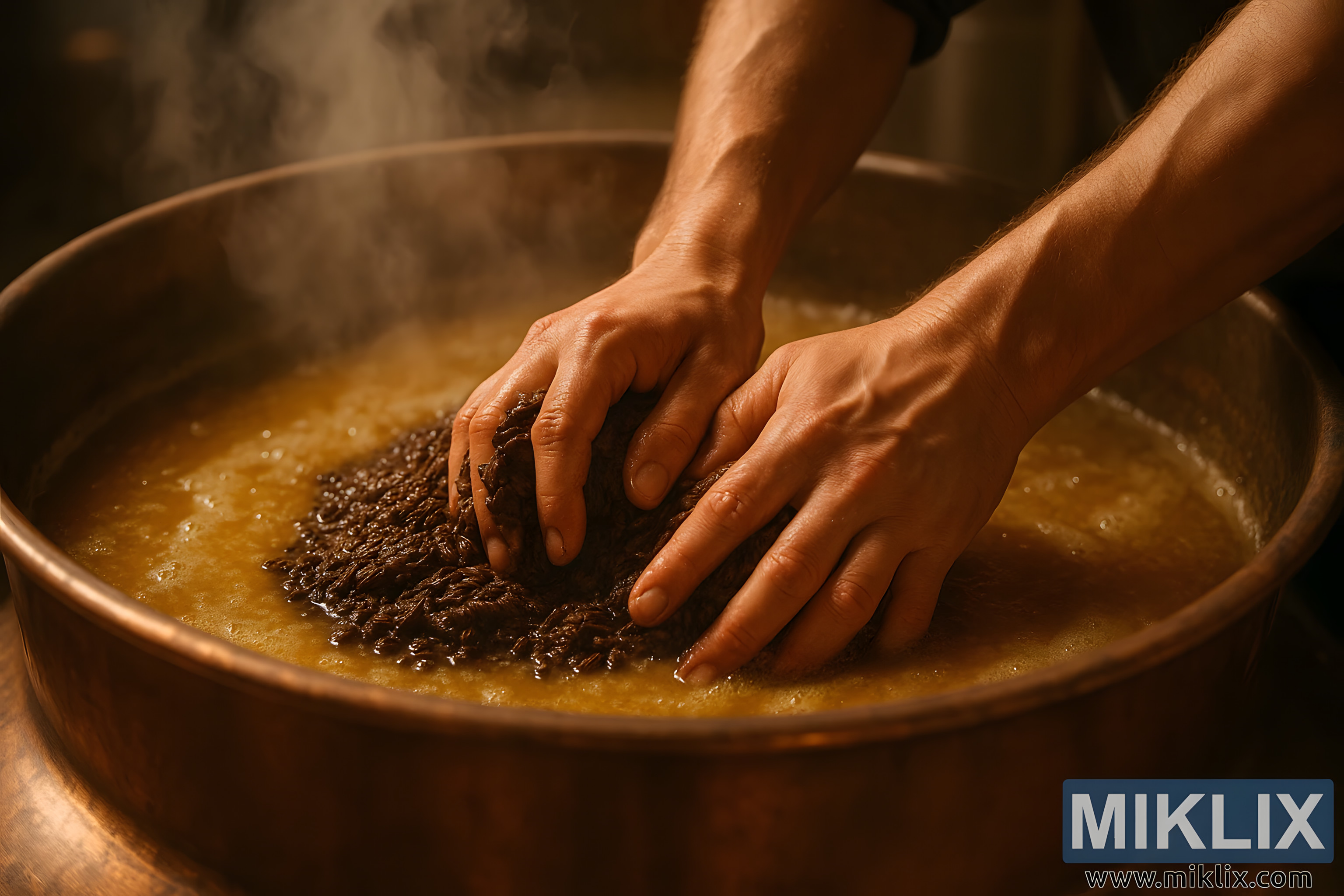 In hierdie suggestiewe nabyskoot vang die beeld 'n oomblik van tasbare intimiteit en ambagsmanlike presisie binne die brouproses vas. Twee hande, verweerd en doelbewus, druk in 'n hoop donkergeroosterde graan – waarskynlik ligte sjokolademout – gedompel in 'n koper brouketel gevul met 'n goudkleurige vloeistof. Die kontras tussen die diep bruin van die mout en die warm, amberkleurige kleure van die mout skep 'n visuele spanning wat spreek van die kompleksiteit van geur wat uit die graan gelok word. Stoom styg in sagte slymvlekke van die oppervlak af, krul in die lug op en vang die lig in sagte, eteriese linte, wat beide hitte en transformasie suggereer.