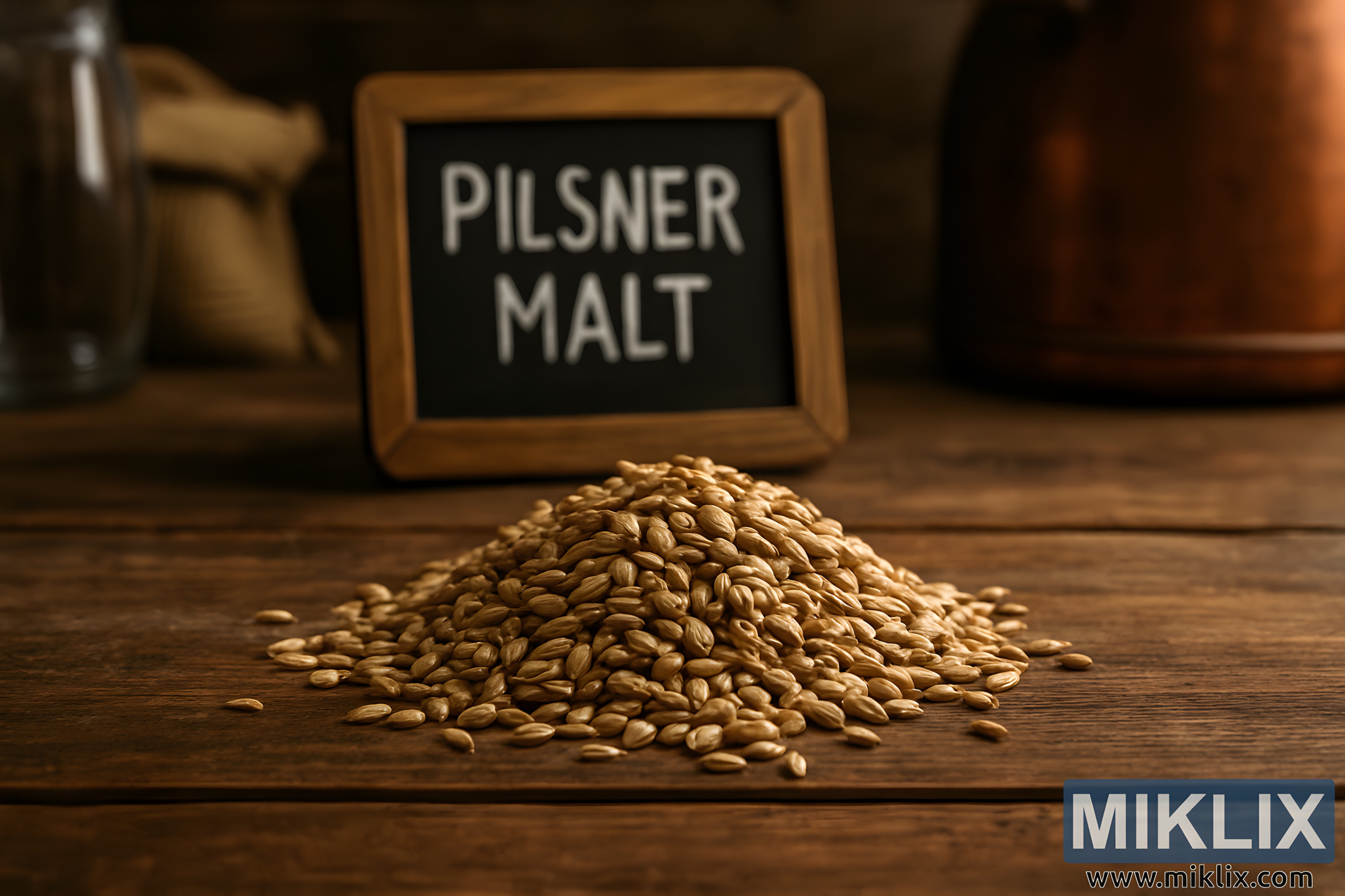 'n Warm, rustieke nabyskootfoto van Pilsner-moutkorrels op 'n houttafel, in 'n tradisionele tuisbrou-omgewing met sagte beligting en ambagsmanlike besonderhede.