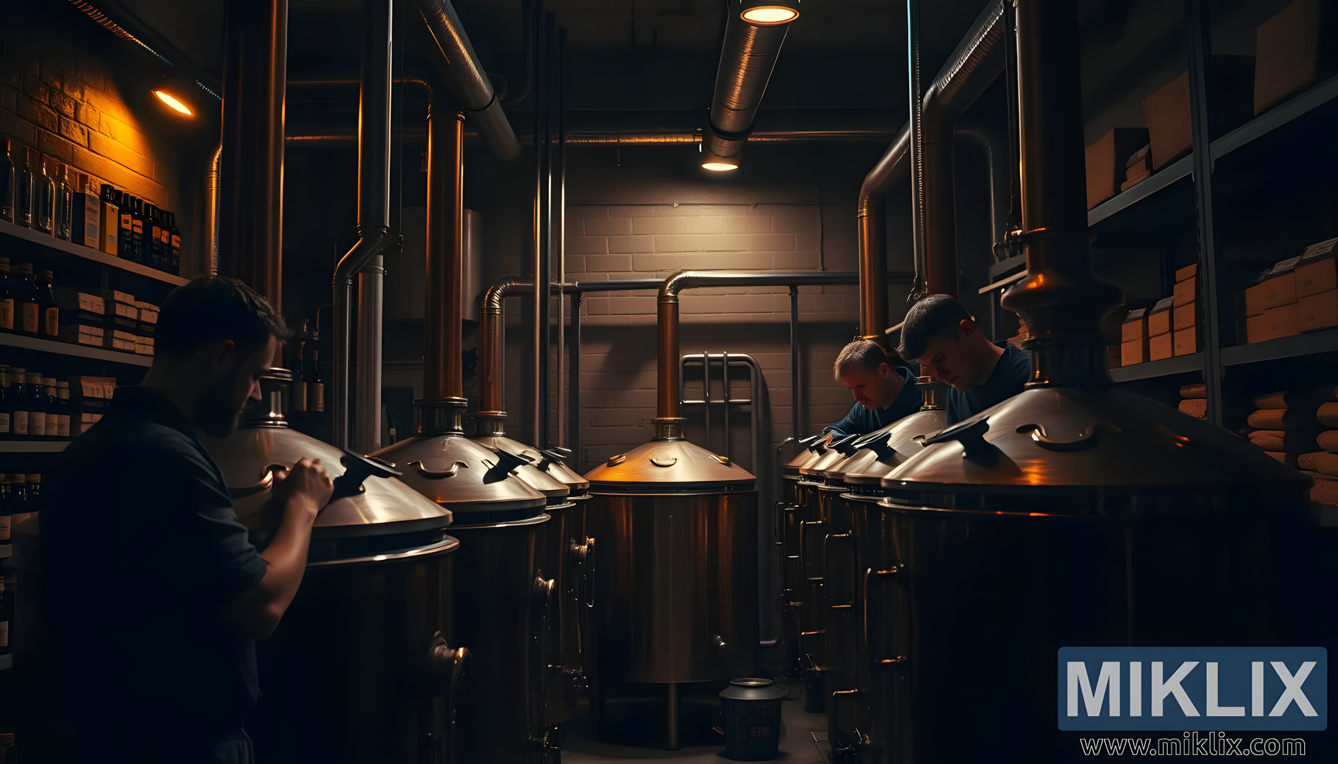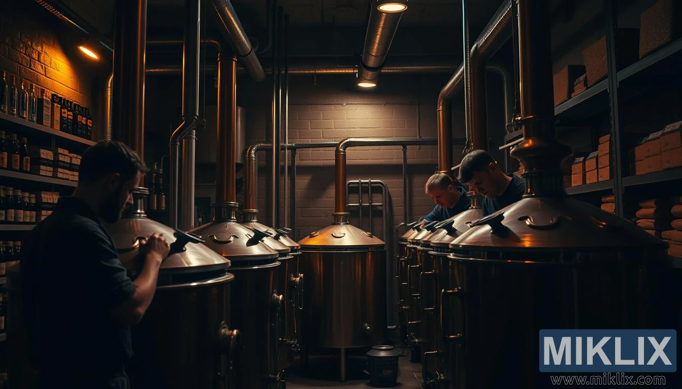 In die middel van die toneel beweeg 'n trio brouers met doelbewuste presisie, elk besig met 'n ander aspek van die brousiklus. Een leun oor 'n beheerpaneel en pas temperatuurinstellings met geoefende gemak aan, terwyl 'n ander in die oop luik van 'n fermentasietenk loer en die konsekwentheid van die mos inspekteer. Die derde staan effens weg, skryf notas in 'n verslete logboek, sy wenkbrou gefrons van konsentrasie. Hul uitdrukkings is bedagsaam, gefokus – nie haastig nie, maar diep betrokke. Dit is duidelik dat dit nie 'n roetine-bondel is nie; die Weense moutbrousel waaraan hulle werk, vereis aandag, finesse en miskien 'n bietjie probleemoplossing om sy volle potensiaal te benut.