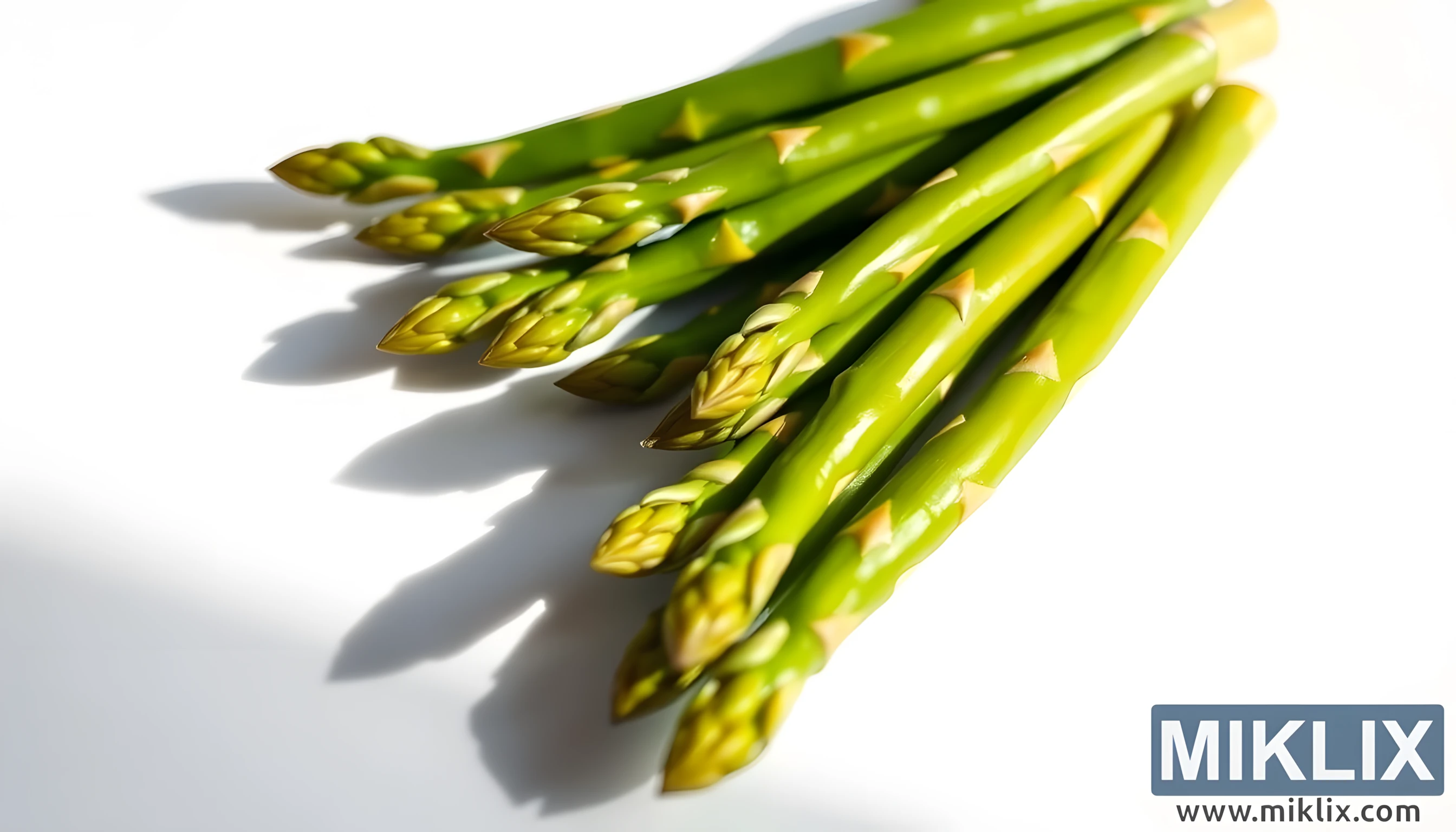 Goed beligte nabyskoot van sappige groen aspersies op 'n wit agtergrond, wat hul varsheid, vitaliteit en natuurlike gesondheidsvoordele beklemtoon.