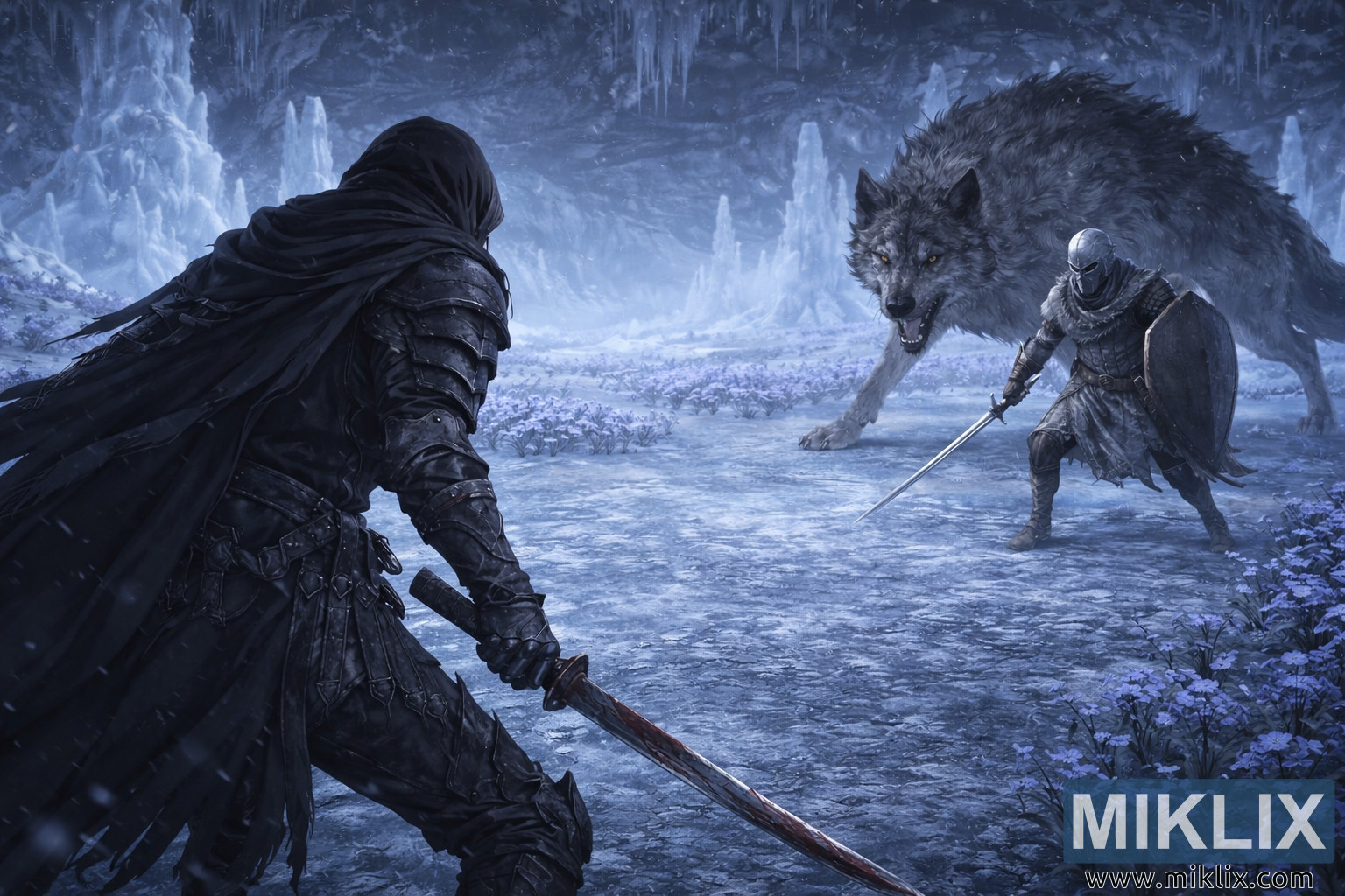 Die omgewing self strek diep in die agtergrond met toringhoë kristallyne yspilare wat soos bevrore katedrale lyk, met hul deurskynende oppervlaktes wat ligte siaan- en indigo-lig breek. Sneeudeeltjies dryf lui deur die lug en skep 'n opgeskorte gevoel van tyd asof die wêreld sy asem ophou voor die botsing. Die grotvloer is 'n mengsel van matte klip en dun weerkaatsende ys wat verwronge silhoeëtte van die figure weerspieël, wat diepte en ruimtelike realisme verbeter. Verspreide fragmente van gebreekte wapens en dowwe voetspore wat in die ryp ingebed is, dui op vorige gevegte en die harde nalatenskap van die arena. Subtiele gradiënte van blou, violet en silwer oorheers die palet, terwyl ingetoë hoogtepunte langs pantserrande en lemoppervlaktes visuele kontras bied sonder om die koue atmosfeer te breek.