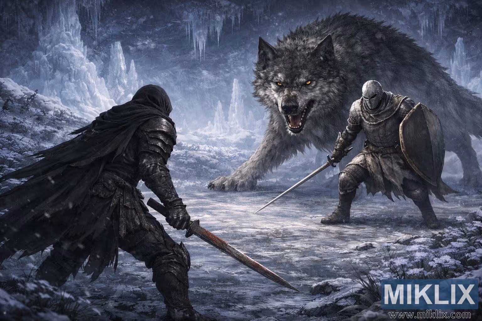 Die grot-omgewing brei uit in elke rigting en onthul toringhoë yspilare en gekartelde stalaktiete wat lyk soos natuurlike katedrale wat deur eeue se ysige wind en druppende water gekerf is. Bleek siaan en silwer lig breek deur deurskynende kristalformasies en versprei sagte gradiënte oor die grond en pantseroppervlaktes. Sneeudeeltjies dryf stadig deur die lug en versterk die gevoel dat tyd stilgestaan het op die presiese oomblik voordat gevegte begin. Die grond bestaan uit gekraakte klip gelaag met dun weerkaatsende ys, wat verwronge silhoeëtte van die figure weerspieël en diepte versterk. Verspreide oorblyfsels van gebreekte wapens, dowwe voetspore en vlak skeure onder die ryp dui op vroeëre stryde wat in hierdie meedoënlose arena gevoer is. Die kleurpalet word oorheers deur koel bloue, gedempte grys en silwerwit, met minimale warm kleure beperk tot die wolf se oë en subtiele metaalweerkaatsings, wat die erge koue van die omgewing versterk.