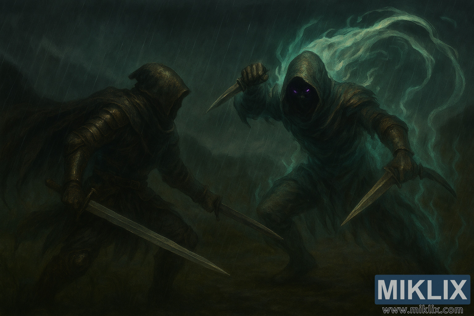 Hierdie semi-realistiese digitale skildery vang 'n gespanne en atmosferiese tweestryd vas tussen twee ikoniese Elden Ring-karakters: die Tarnished en Alecto, Black Knife Ringleader. Afgespeel binne die spektrale grense van Ringleader se Evergaol, ontvou die toneel onder 'n stormagtige naghemel, met reën wat in diagonale strepe kaskadeer en mis wat die verre heuwels en antieke klipformasies versluier. Die omgewing is deurdrenk en somber, met plasse wat die dowwe gloed van magiese energie weerspieël en die silhoeëtte van die vegters.