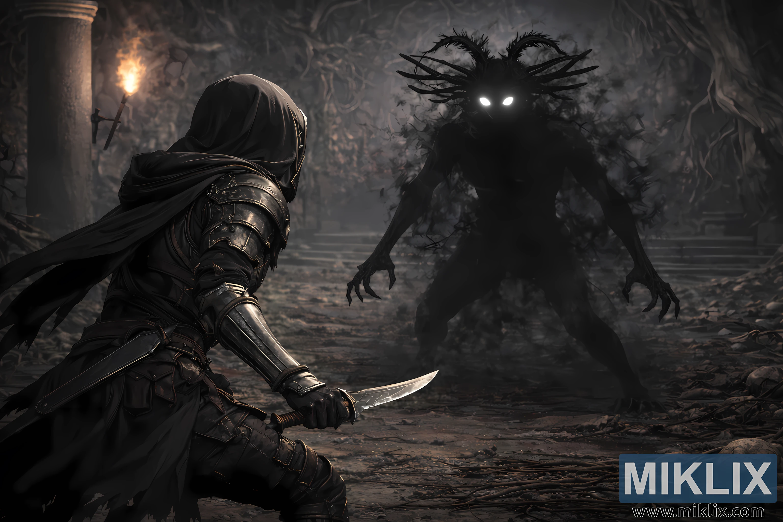 Die kleurpalet is gedemp en ingehoue, oorheers deur koue grys, diep swart en onversadigde bruin. Warm kleure verskyn slegs in die flitslig, wat subtiele kontras bied sonder om die toneel te oorweldig. Die algehele stemming is grimmig, gespanne en gegrond, en vang 'n oomblik van stille konfrontasie vas waar beide Tarnished en monster op 'n treffende afstand staan, bewus daarvan dat die volgende beweging die stilte sal verbreek en in geweld sal uitbars.