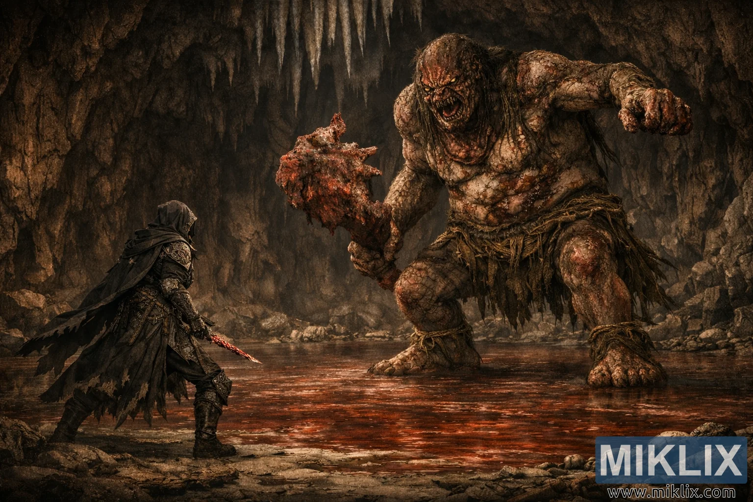 Die beeld vang 'n wye, teruggetrekte uitsig oor die Rivermouth-grot vas, wat 'n breër arena onthul waar die Tarnished en die Chief Bloodfiend mekaar in die gesig staar. Die grot voel nou grotagtig eerder as beknop, met die verste mure wat in die skaduwee terugtrek terwyl ongelyke rotsterrasse en ingestorte klip die rande van die toneel raam. Gekartelde stalaktiete hang in digte trosse van die plafon af, sommige verdwyn in drywende mis naby die boonste dele van die kamer. Die grond word oorstroom met 'n vlak, bloedrooi poel wat amper muur tot muur strek en die figure in gebroke, bewerige patrone weerspieël. Dowwe, amber lig filter in vanaf ongesiene skeure en werp lang skaduwees oor die water en klip.