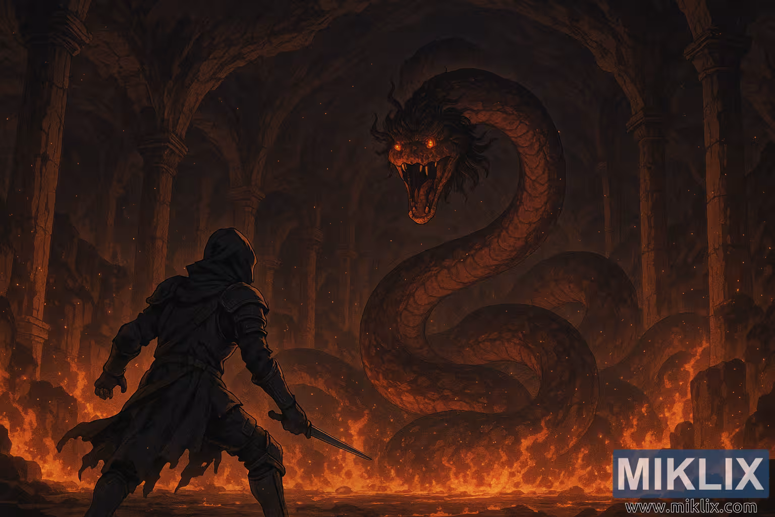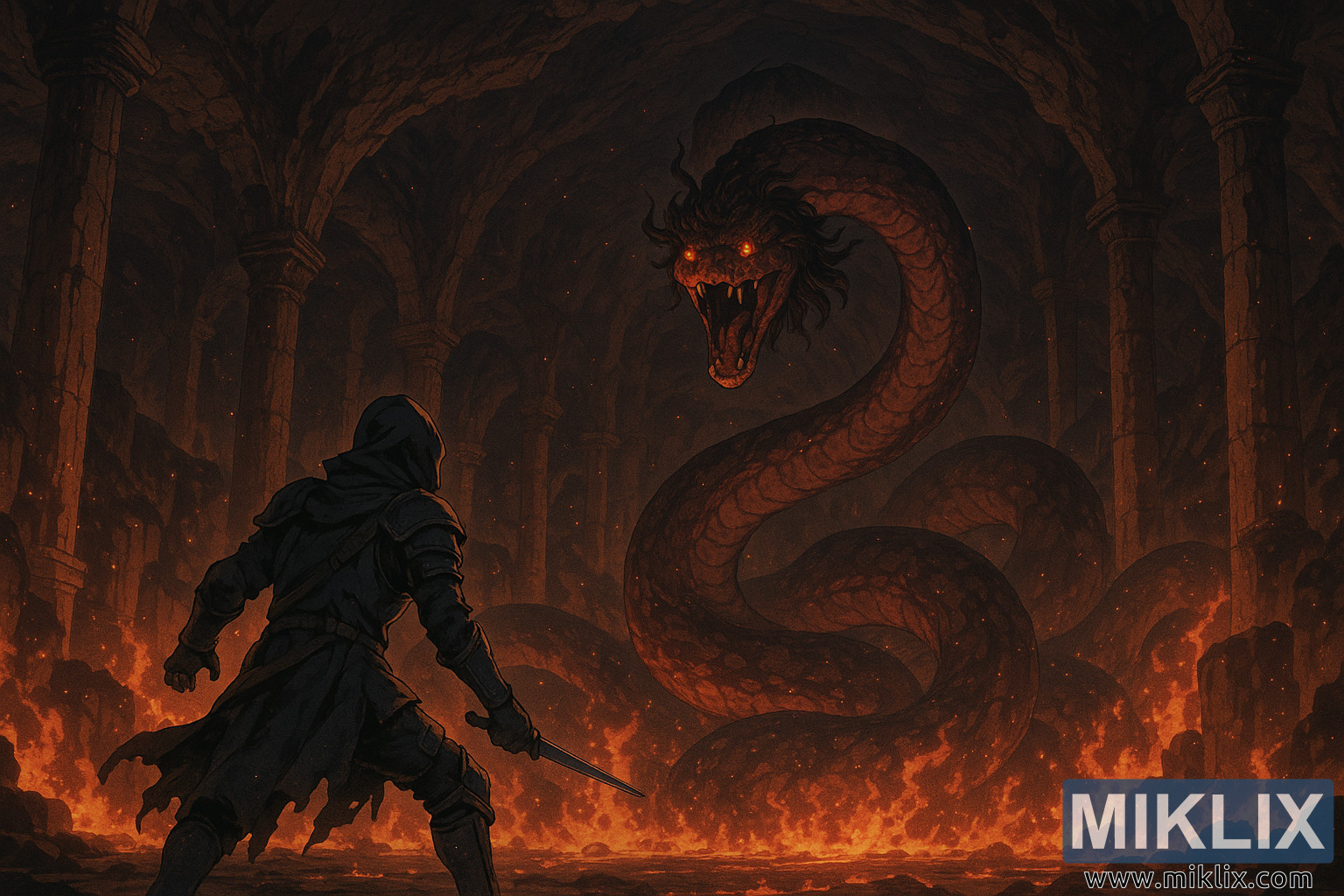 'n Versierde anime-styl illustrasie van 'n Gesmolten kryger wat 'n kolossale slang in 'n ontsaglike vulkaniese grot konfronteer, omraam deur toringhoë pilare en riviere van vuur.