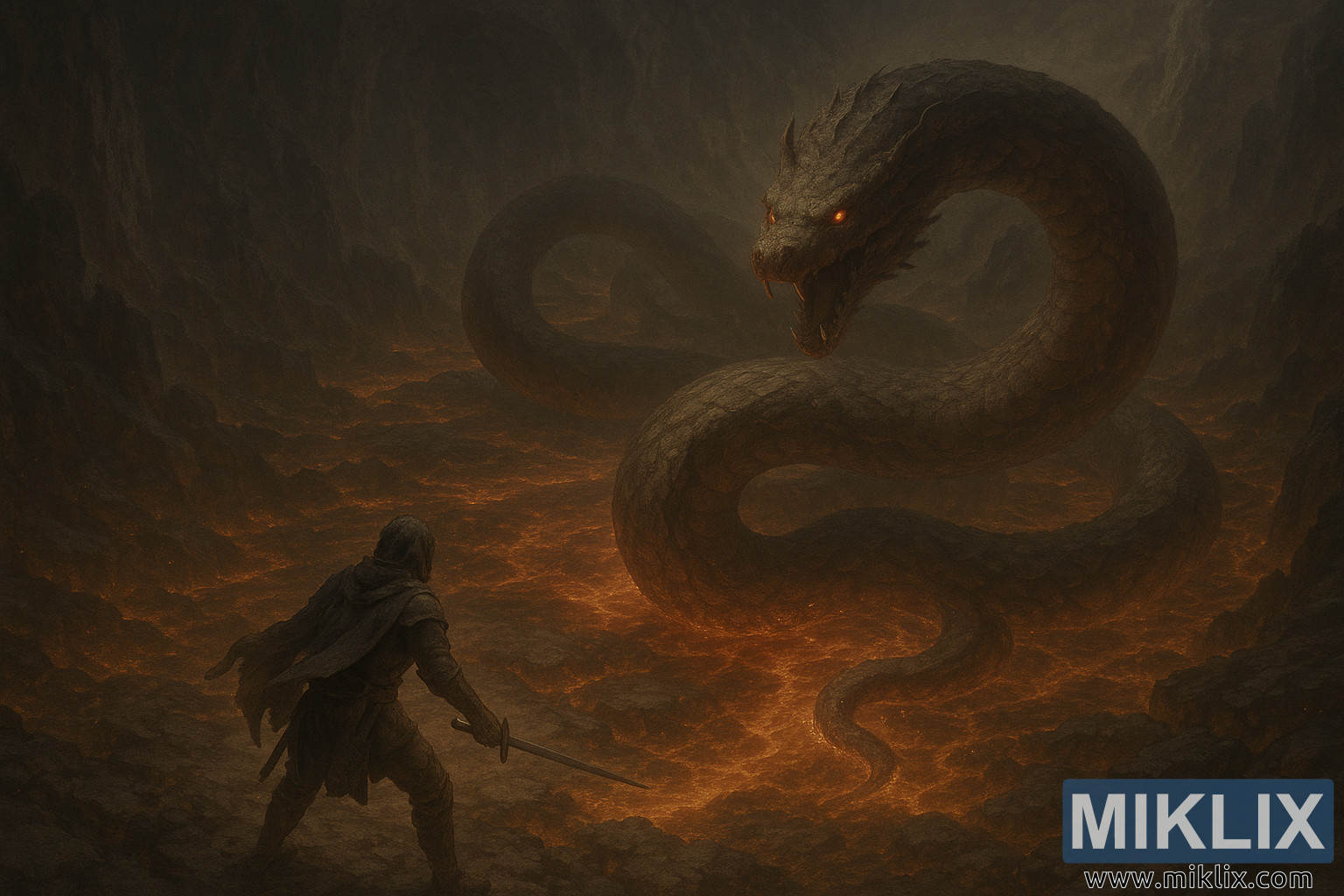 Hierdie beeld beeld 'n ontsaglike ondergrondse arena van vuur en klip uit, vasgevang in 'n oomblik van stilte voor geweld. 'n Eensame, Verweerde kryger staan in die onderste voorgrond, teenoor 'n ontsaglike slang wat oor 'n see van gesmelte rots kronkel. Die toneel word amper geheel en al verlig deur die gloed van vulkaniese hitte onder – kole en skeure pols soos die hartklop van die grot, wat verskuiwende oranje lig oor skubberige vlees, wapenrusting en gekartelde terrein werp.