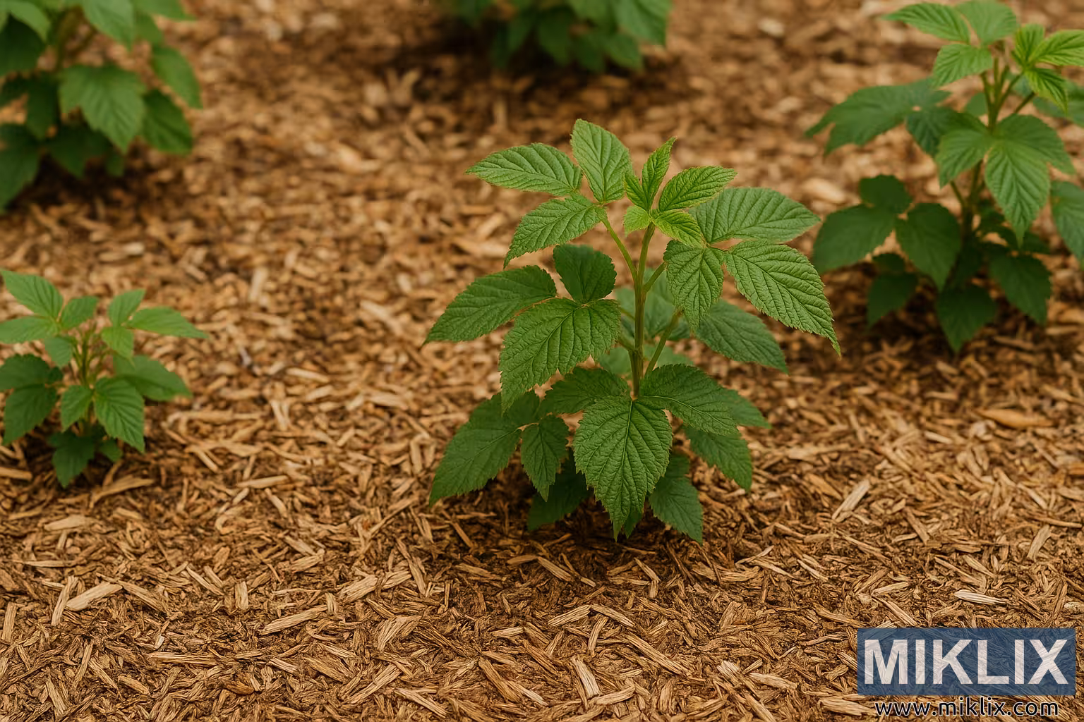 'n Gedetailleerde aansig van jong framboosplante omring deur organiese houtdeklaag, wat effektiewe deklaagtegnieke demonstreer om vog te bewaar, temperatuur te reguleer en gesonde groei in tuine te bevorder.