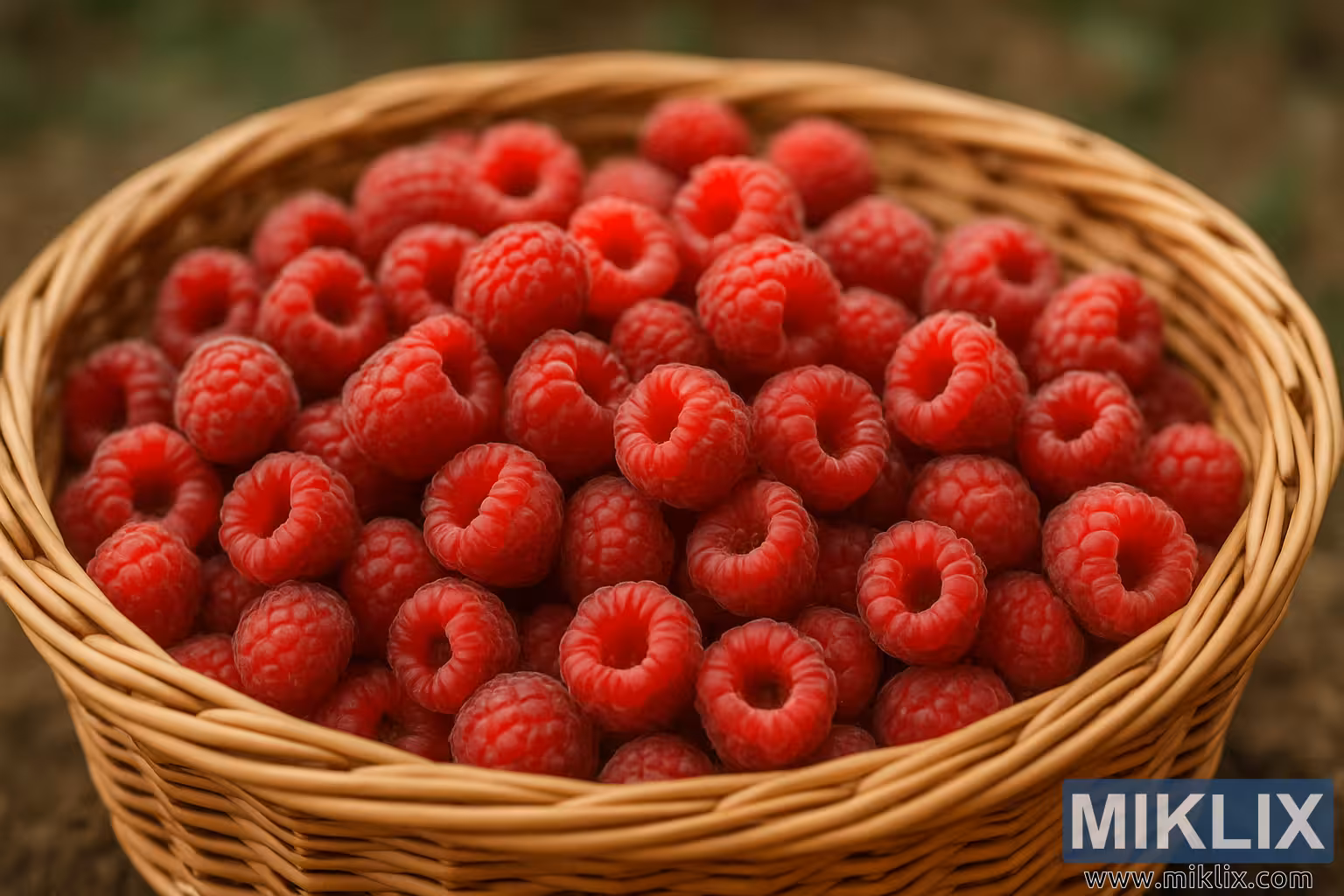 Die komposisie is intiem maar uitgebreid, en fokus hoofsaaklik op die boonste helfte van die mandjie se binnekant, met die rande van die weefsel wat die vrugte natuurlik omraam. Die mandjie self rus op 'n aardse oppervlak, effens uit fokus, wat 'n vars geoeste, landelike omgewing suggereer - miskien 'n tuin, 'n plaas of 'n plattelandse markstalletjie. Die vae agtergrond bestaan uit gedempte groen en bruin skakerings, wat die indruk van sagte blare of 'n natuurlike buitelugomgewing in sagte daglig skep. Hierdie subtiele bokeh-effek trek die kyker se aandag geheel en al na die frambose en beklemtoon hul kleurintensiteit en organiese tekstuur.
