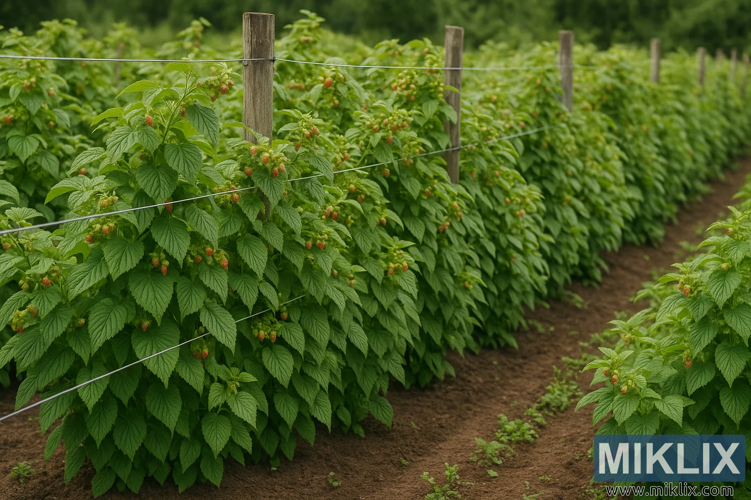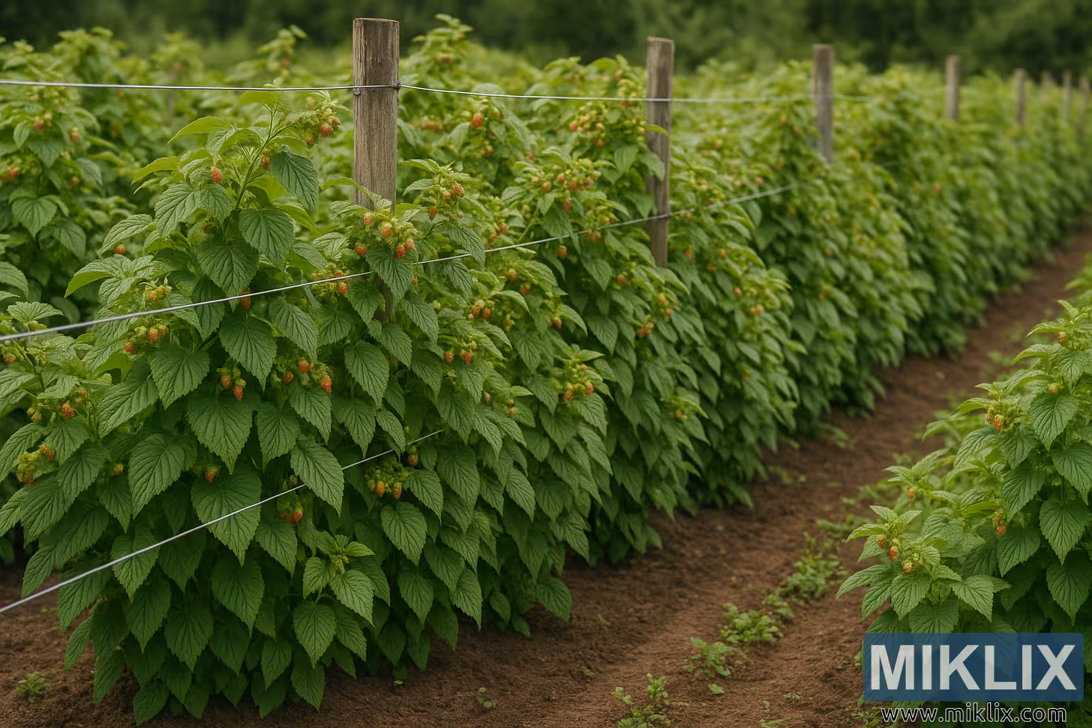 Healthy Raspberry Patch with Trellis Support System in Summer Growth