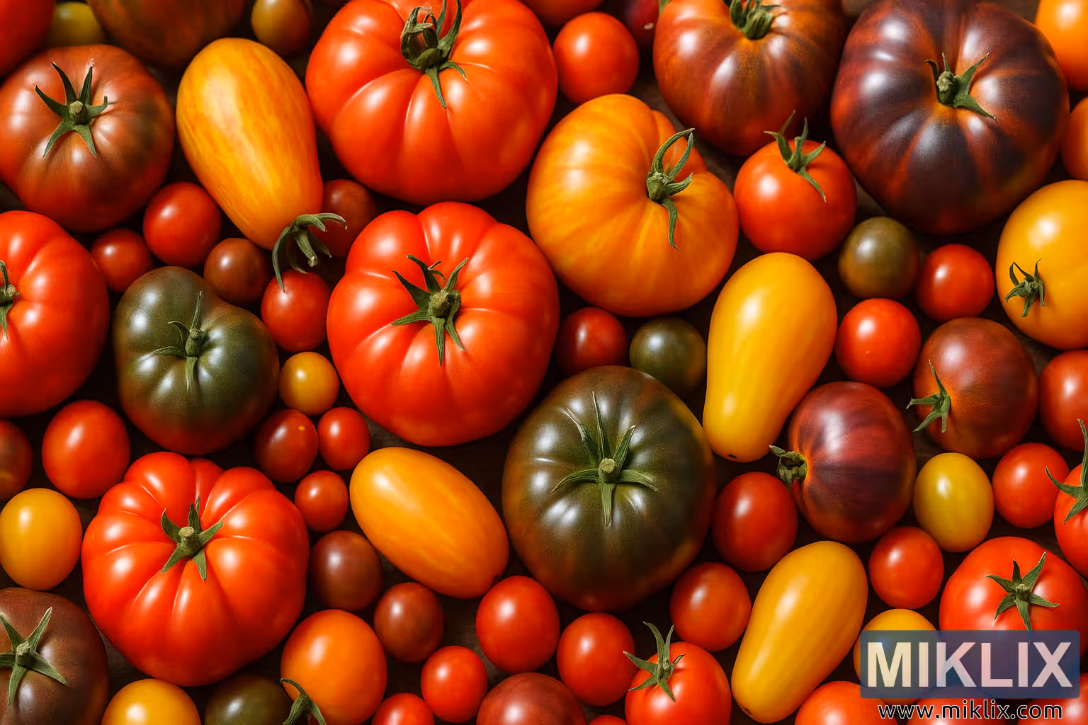 Die tamaties word dig op mekaar gerangskik, wat 'n gevoel van oorvloed en organiese diversiteit skep. Hul vorms wissel van perfek rond tot onreëlmatig en gelob, met sommige wat effens plat lyk terwyl ander uitbult met duidelike riwwe. Die blink oppervlaktes van baie tamaties weerkaats sagte, diffuse lig, wat hulle 'n vars, pas-geoesde voorkoms gee. 'n Paar matskilvariëteite bied subtiele kontras, wat die tekstuurverskille oor die verspreiding beklemtoon. Die stingels – sommige steeds aangeheg – voeg 'n bykomende laag visuele belangstelling by, met hul groen stervormige kelke wat klein sarsies kleur en struktuur skep teen die warm skakerings van die vrugte.
