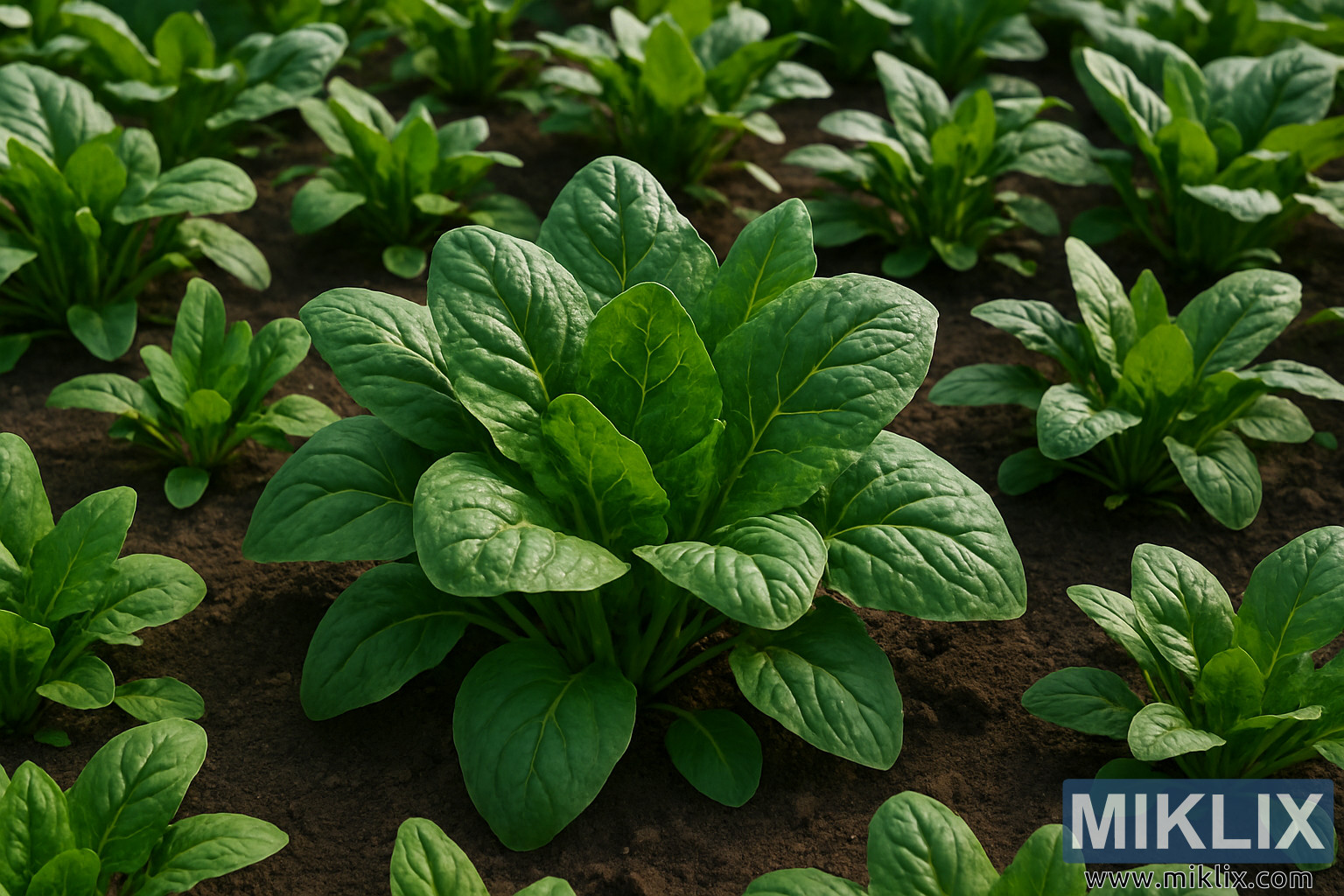 Welige rye spinasieplante met breë, blink groen blare floreer in ryk grond onder sonlig, wat varsheid, groei en tuinoorvloed ten toon stel.