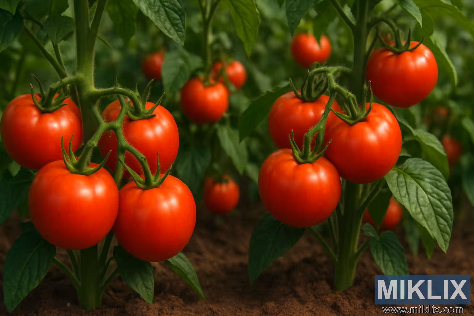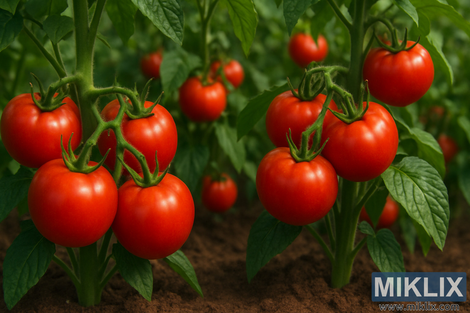 In die hartjie van 'n florerende tuin ontvou 'n lewendige tapisserie van tamatieplante in ryk detail, elke rank swaar met die belofte van oes. Die grond daaronder is donker en vrugbaar, fyn bewerk en getekstureer, wat 'n voedende fondament bied vir die welige groenigheid wat daarbo uitstyg. Vanuit hierdie aardse bedding strek dik stingels opwaarts en uitwaarts, wat 'n oorvloed vrugte ondersteun wat glinster in die sagte omhelsing van natuurlike sonlig. Die tamaties, rond en mollig, hang in ruim trosse, hul blink rooi skille vang die lig en werp subtiele weerkaatsings wat hul rypheid en vitaliteit beklemtoon.