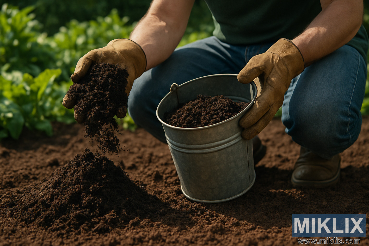 'n Tuinier kniel in 'n welige tuin en skep donker kompos uit 'n emmer op bewerkte grond, met groen plante wat in die agtergrond vaag is.