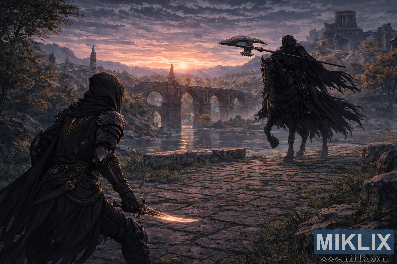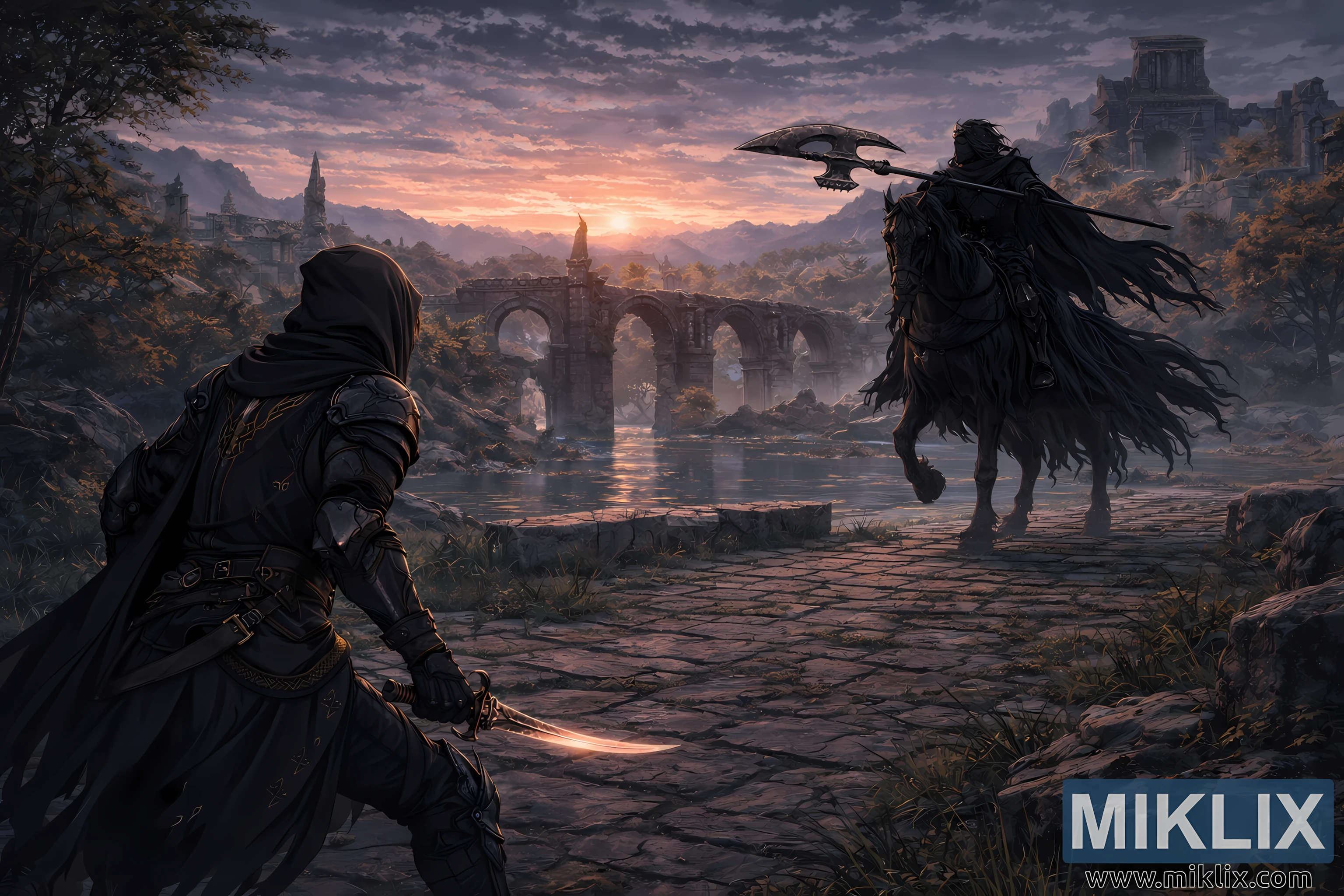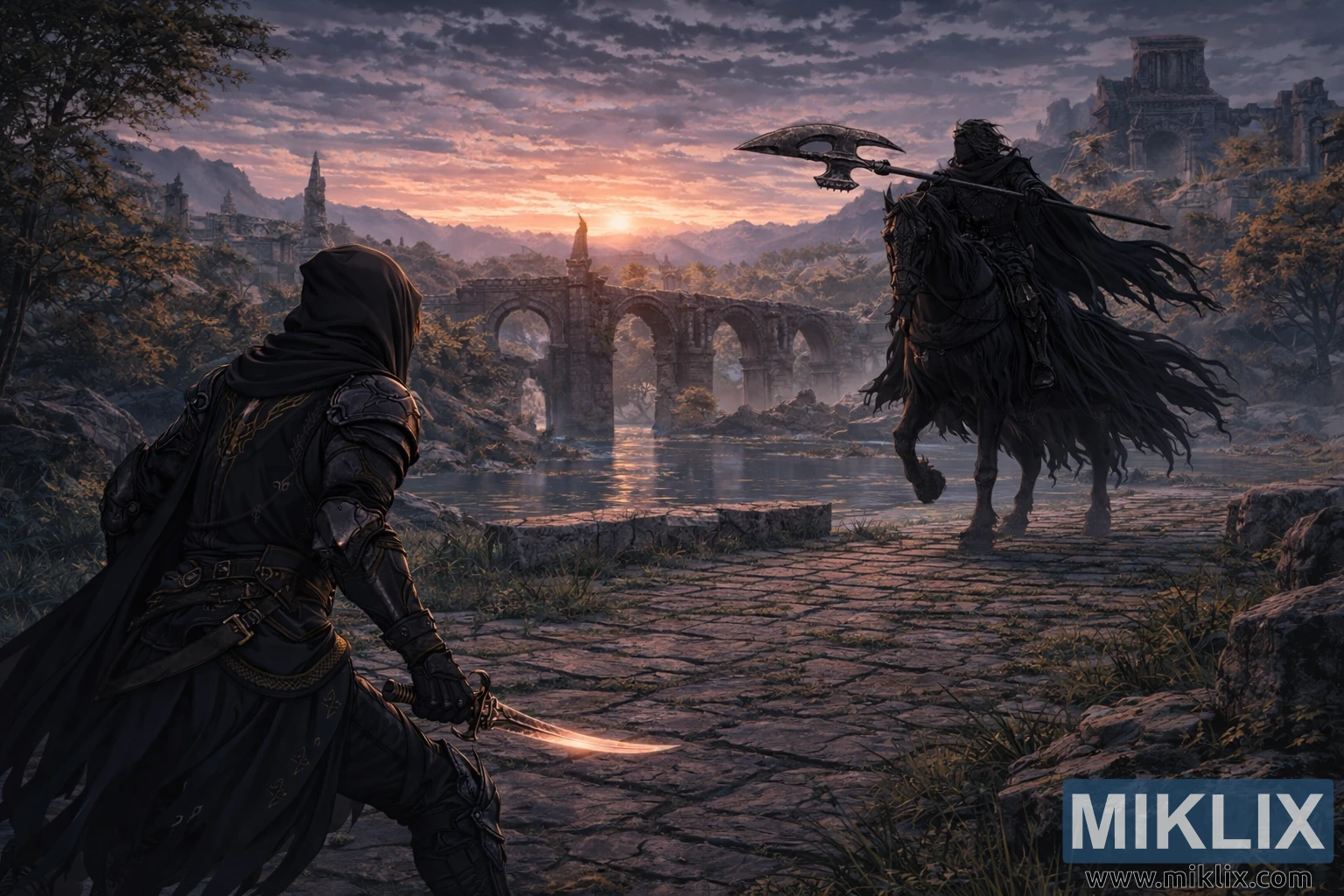 تتسع البيئة المحيطة بهم، كاشفةً عن جسر غيت تاون بتفاصيل أدق. الممر الحجري تحت أقدامهم متصدع وغير مستوٍ، وتنمو فيه الأعشاب والنباتات الصغيرة من بين الشقوق. خلف المواجهة، تمتد أقواس مكسورة فوق مياه هادئة، تعكس السماء في تموجات خافتة. تملأ الأبراج المدمرة والجدران المتداعية والتلال البعيدة الخلفية، محجوبة جزئيًا بضباب جوي. تهيمن السماء على النصف العلوي من المشهد، مرسومة بسحب متراكمة وألوان شفق غنية - برتقالي ووردي دافئ قرب الشمس يتلاشى إلى أرجواني وأزرق بارد في الأعلى.