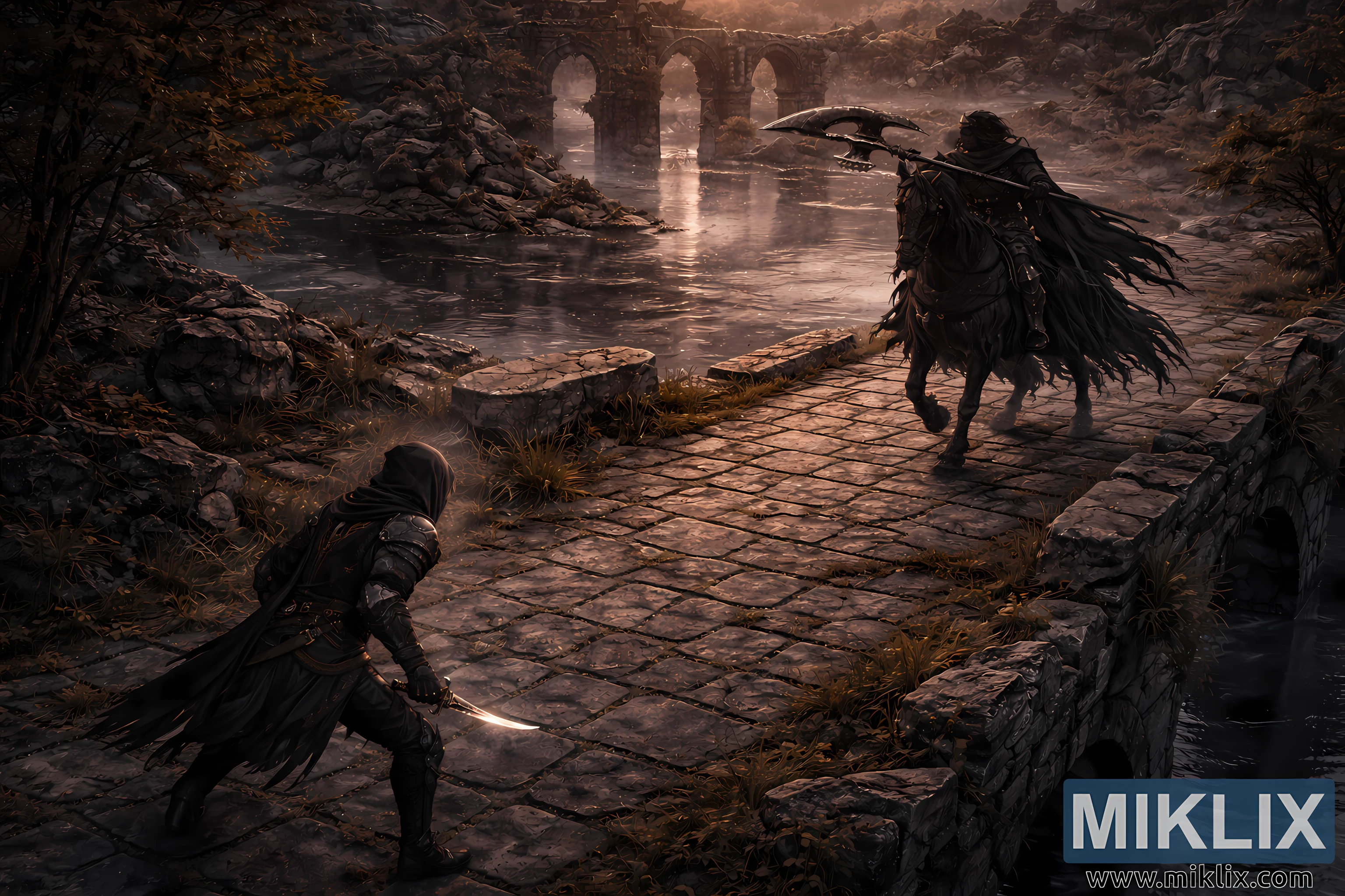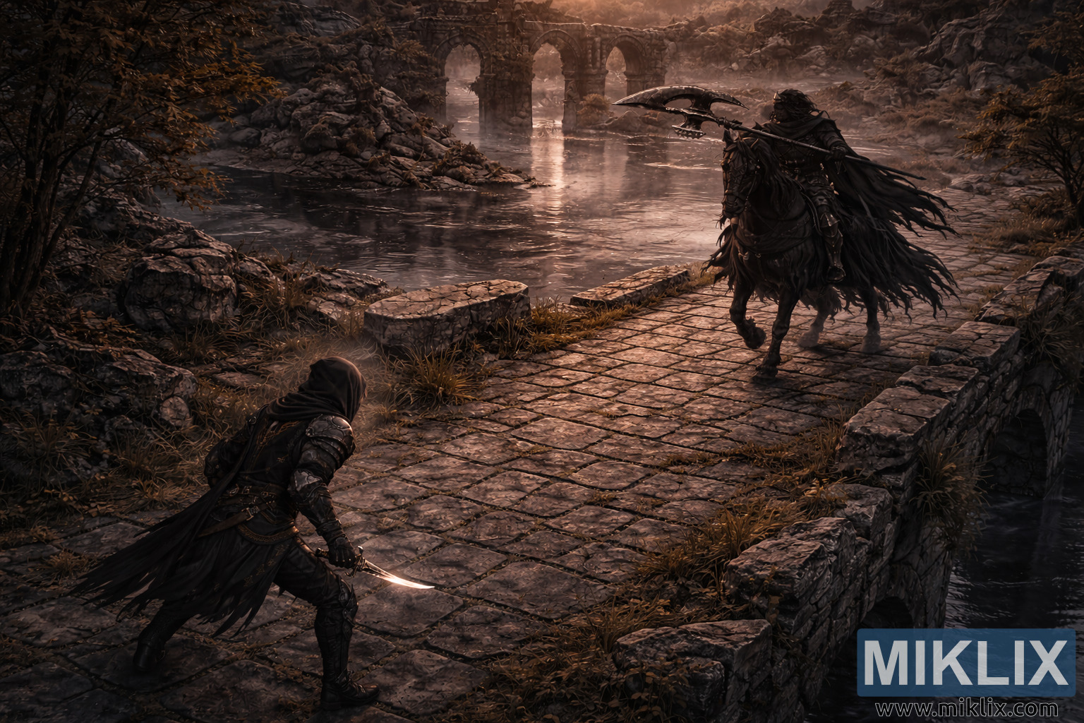 تُصوّر الصورة مشهدًا خياليًا مظلمًا مستوحى من لعبة Elden Ring، من منظور مُنخفض ومرتفع، يُشبه المنظور المتساوي القياس، مما يُبرز التباعد التكتيكي وحجم البيئة. تنظر الكاميرا من أعلى بزاوية فوق جسر مدينة البوابة، مما يُضفي على المواجهة طابعًا استراتيجيًا، أشبه برقعة الشطرنج، مع الحفاظ على جو سينمائي. تدور أحداث المشهد عند الغسق، بإضاءة طبيعية خافتة تمزج بين درجات ألوان الغروب الدافئة والظلال الباردة.