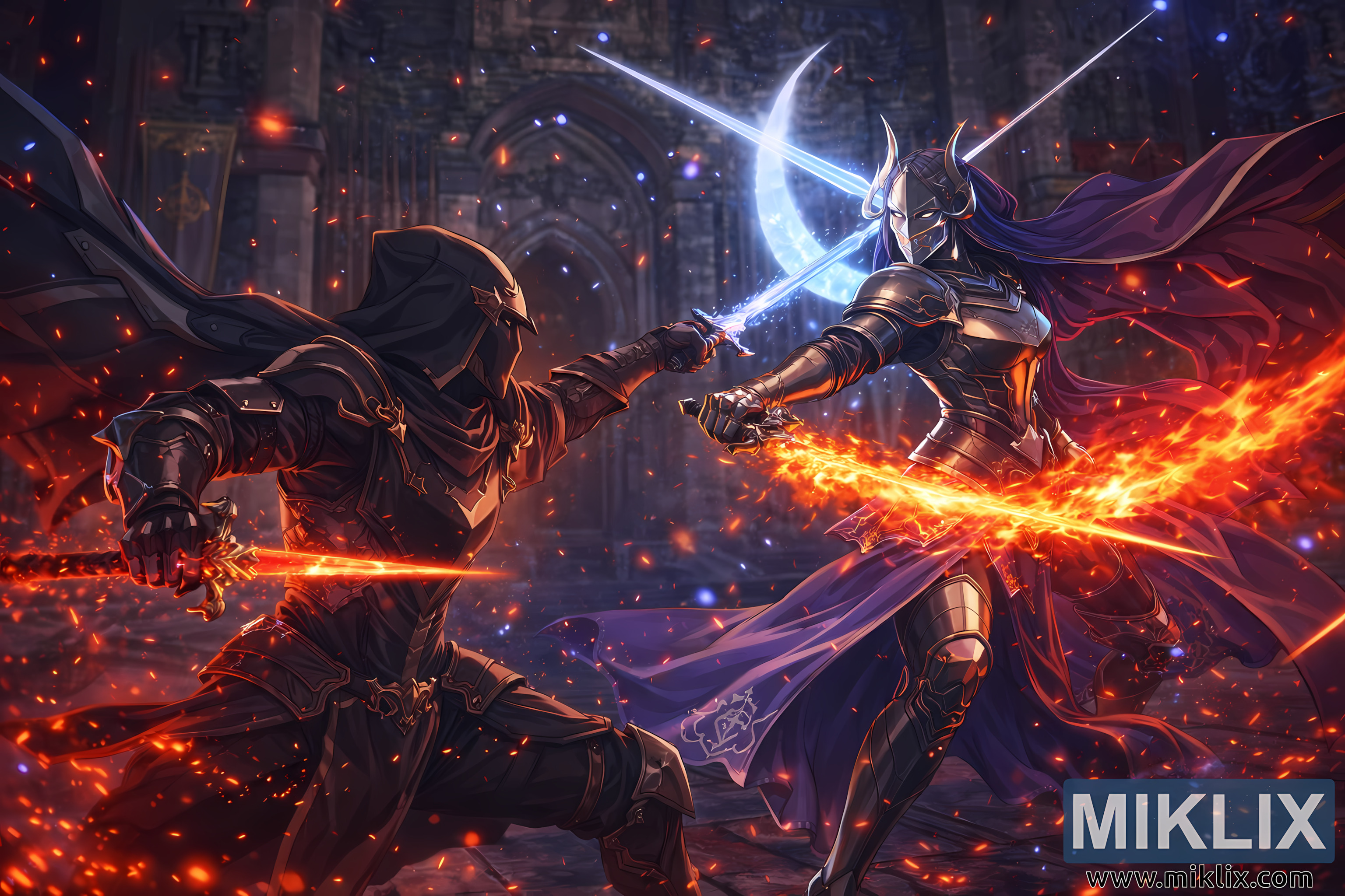تُصوّر الصورة مشهد معركةٍ دراميًّا مستوحى من الأنمي، تدور أحداثه في أعماق قاعات قلعة إنسيس الحجرية المقببة. ترتفع أقواسٌ قوطيةٌ شاهقةٌ في الخلفية، وتختفي طوبها المتآكل جزئيًّا في الظل، بينما يتسلل ضوء القمر الخافت عبر فتحاتٍ غير مرئيةٍ في الأعلى. تتناثر جمراتٌ متوهجةٌ وشظايا من غبار النجوم الأزرق والأبيض في الهواء، لتملأ المكان بإحساسٍ بسحرٍ معلقٍ وحركةٍ عنيفة. في مركز التكوين، يتصارع شخصيتان أسطوريتان من الأراضي الواقعة بين العالمين، وتتصادم أسلحتهما في وابلٍ من الشرر والضوء الغامض.