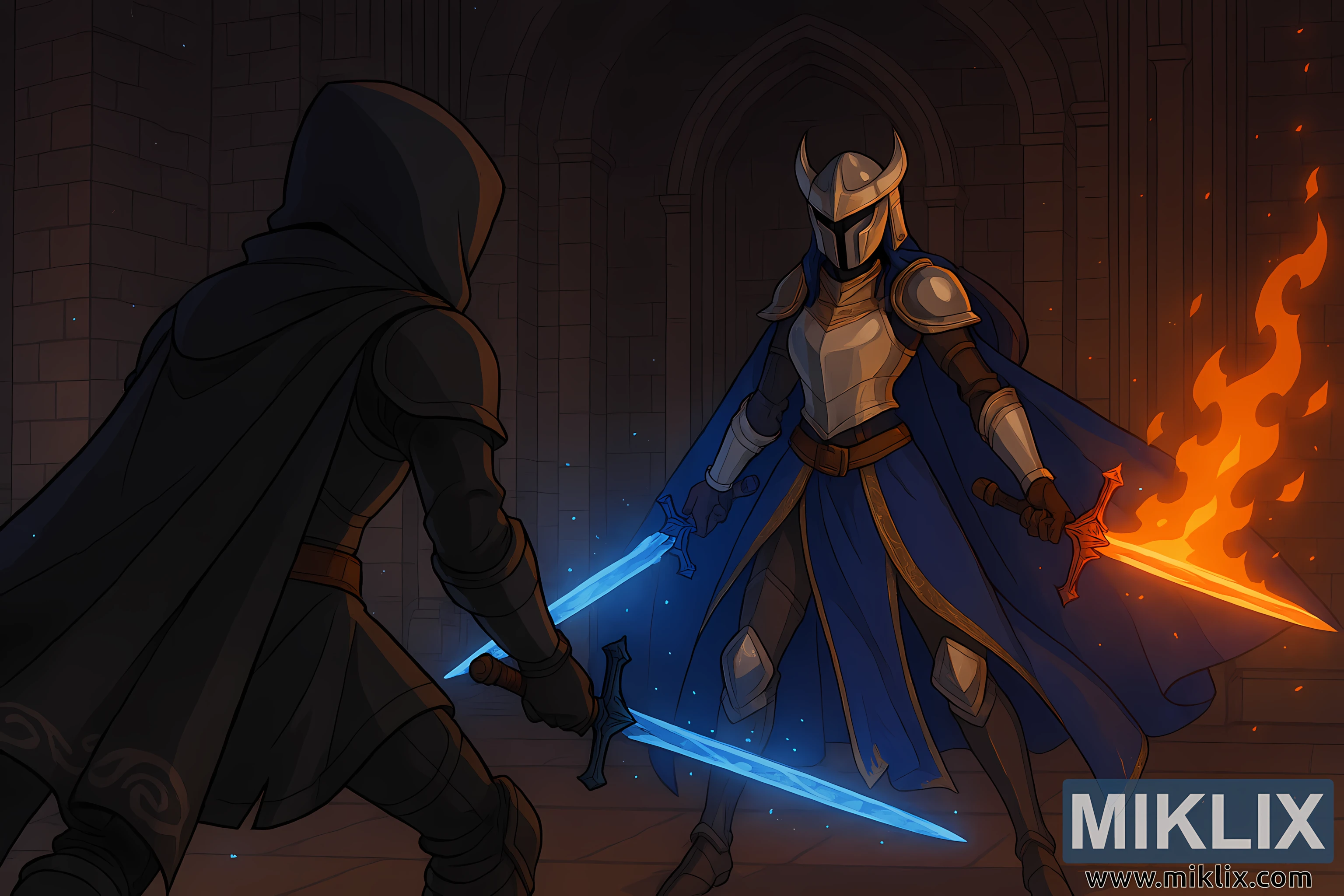 في الجهة المقابلة له، على يمين الإطار، تقف ريلانا، فارسة القمر التوأم، وقد رُسمت بقوام أنحف وأكثر أنوثة. يتلألأ درعها الفضي والأزرق السماوي تحت ضوء القمر الخافت، مُزينًا بتطريزات ذهبية ورداء أزرق متدفق يرفرف بشكلٍ لافت. يتميز خوذتها بشعار هلالي الشكل وقناع على شكل حرف T، يُخفي وجهها ولكنه يُظهر تركيزها الشديد. في يدها اليمنى، تحمل سيفًا مُشتعلًا يتوهج بطاقة برتقالية وحمراء، مُلقيًا ضوءًا مُتراقصًا على أرضية الحجر. وفي يدها اليسرى، تحمل سيفًا جليديًا يتوهج بضوء أزرق جليدي، مُطلقًا جزيئات مُتلألئة في الهواء.