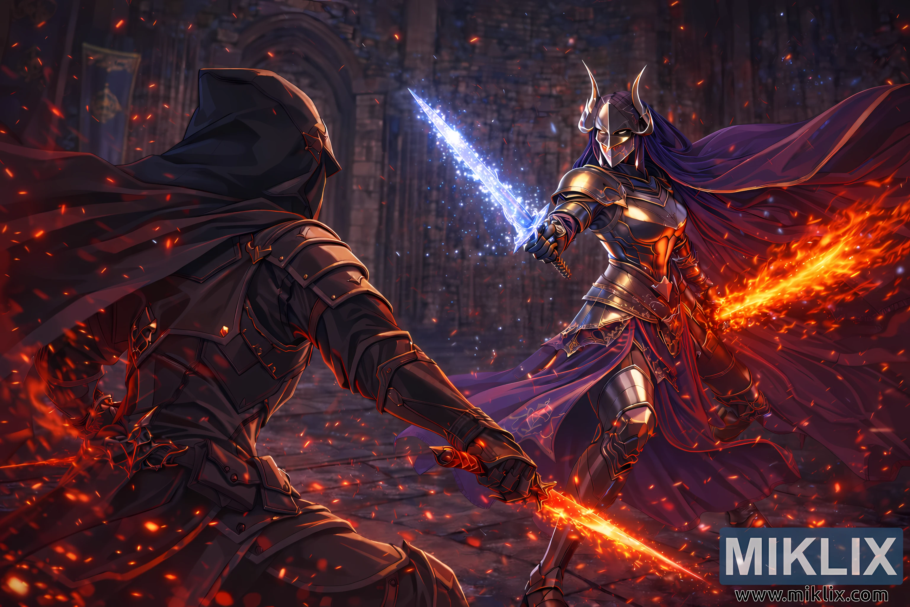 تُجسّد الصورة مواجهةً دراميةً داخل قاعات قلعة إنسيس الشاسعة التي تُشبه الكاتدرائية. تعلو الأقواس الحجرية الضخمة، وقد اسودّت طوبها القديمة بفعل الزمن والسخام، بينما تملأ الشرر المتطايرة وذرات السحر المتوهجة الأجواء كعاصفةٍ مُجمّدةٍ في الزمن. يبدو المشهد برمّته مُعلّقًا بين الحركة والسكون، كما لو أن صدام السيوف قد أوقف تدفق العالم للحظات.