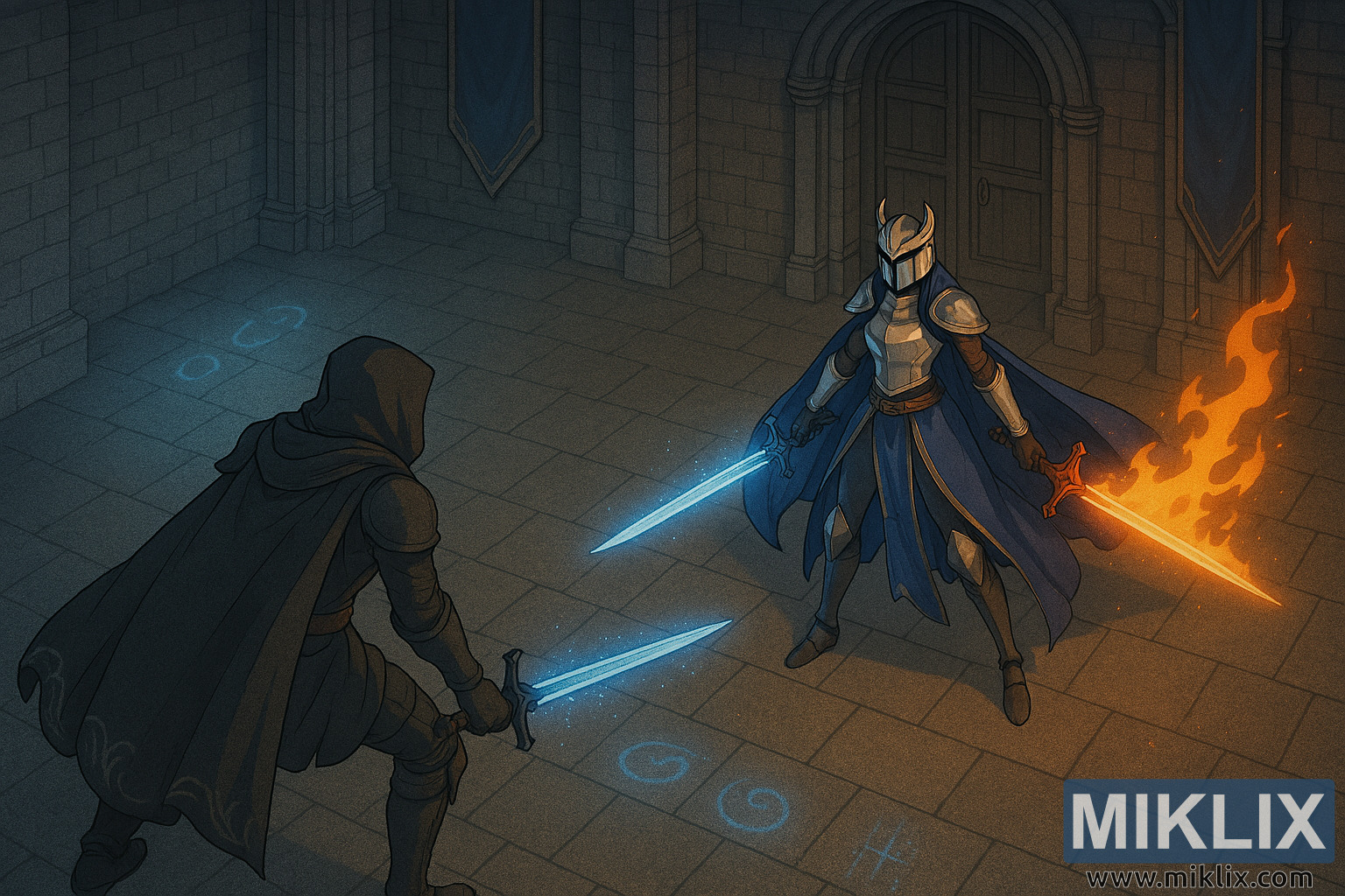 على الجانب الأيسر من الإطار، يقف "المُشوَّه"، مرتدياً درع "السكين الأسود" المُخيف. يظهر جسده المُغطى بغطاء الرأس من الخلف، دون شعر ظاهر، مما يُؤكد طبيعته الخفية والغامضة. درعه المُقسَّم أسود غير لامع مع لمسات فضية خفيفة، ويمسك بيده اليمنى سيفاً جليدياً مُتوهجاً. يُصدر النصل ضوءاً أزرق بارداً، ويترك أثراً من جزيئات الجليد المتلألئة على أرضية الحجر البالية. وقفته منخفضة ورشيقة، مع وضع إحدى قدميه للأمام وجسمه مُوجّهاً دفاعياً نحو خصمه.