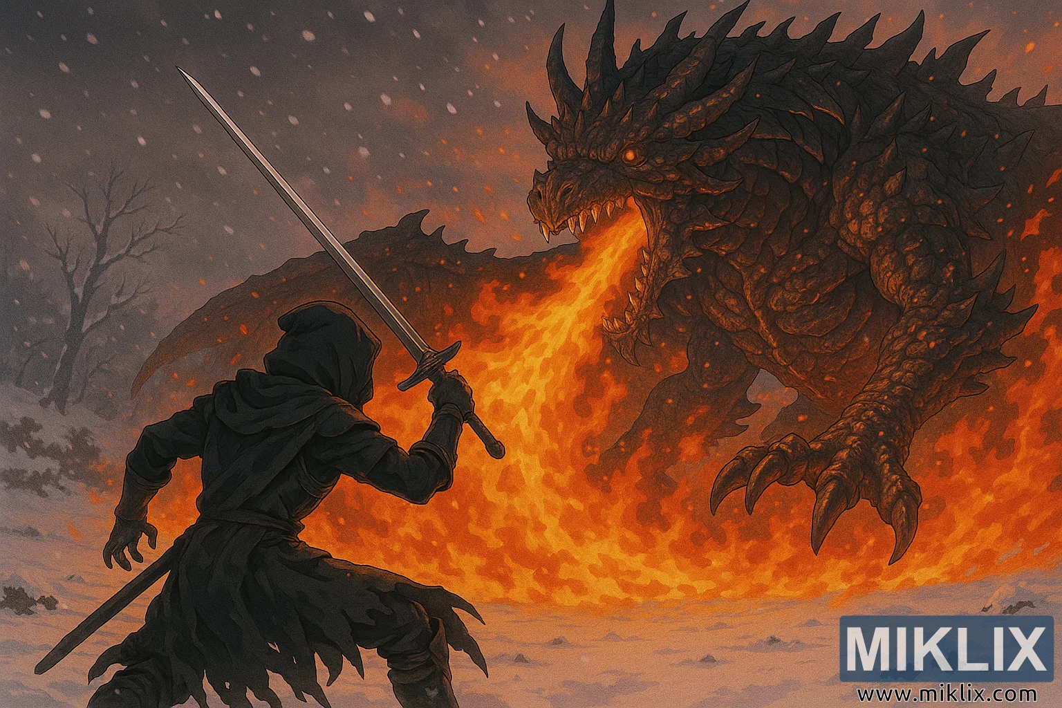 صورة: محارب السكين الأسود ضد التنين العظيم في حقل الثلج