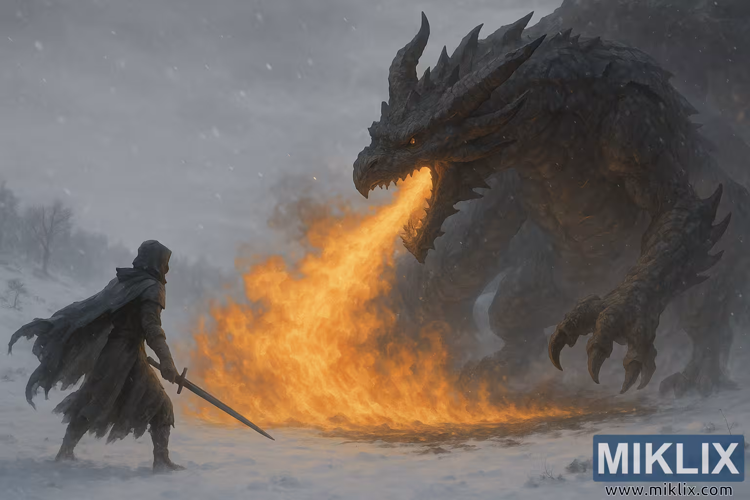 ساحة معركة ثلجية واقعية حيث يواجه محارب وحيد تنينًا ضخمًا ينفث النار وسط الثلوج المتصاعدة واللهب المنصهر.