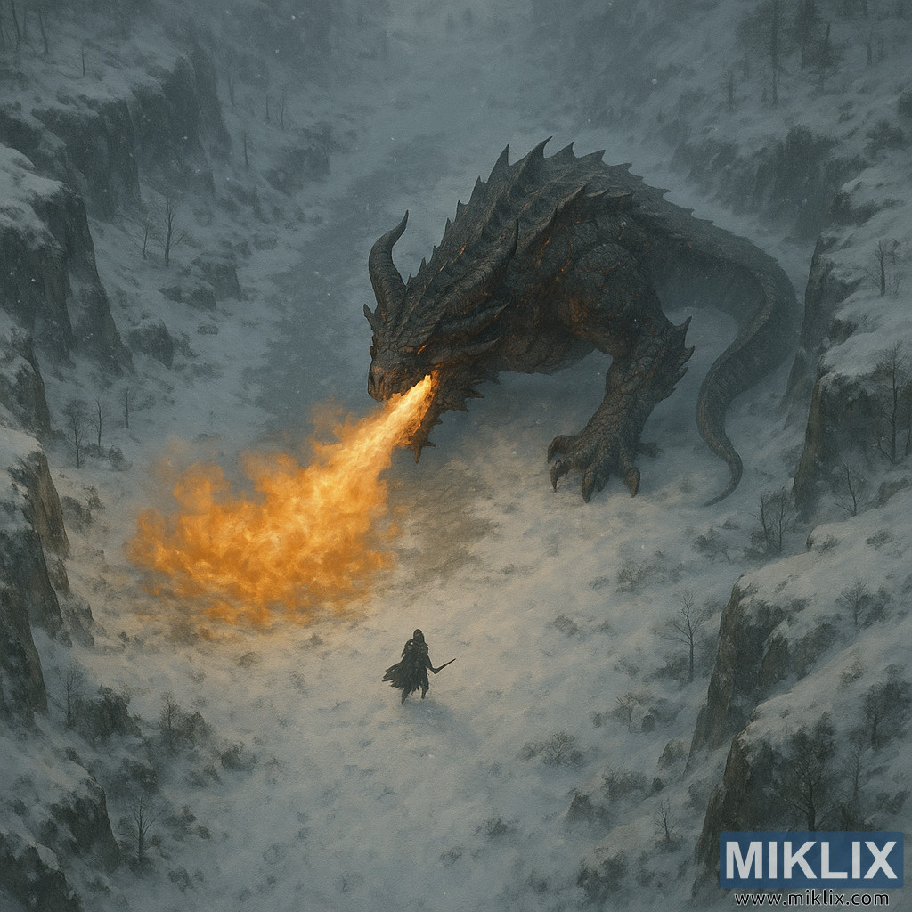 في مواجهة هذا المخلوق الوحشي، يقف محارب وحيد يرتدي درع السكين الأسود، ويبدو تافهًا من منظور علوي. يقف المحارب متمركزًا في مسار التنين، كشخصية داكنة صغيرة وسط البياض الشاسع. تتدلى عباءته الممزقة خلفه، وقد أمسكتها الرياح في منتصف حركته. السيف مسلول وجاهز، ولكن من هذا المنظور، تعكس هذه الوقفة الشجاعة والضعف. تتناقض صورة المحارب الظلية الداكنة بشكل حاد مع النيران المتوهجة المتصاعدة نحوه، مما يؤكد جسامة التهديد.