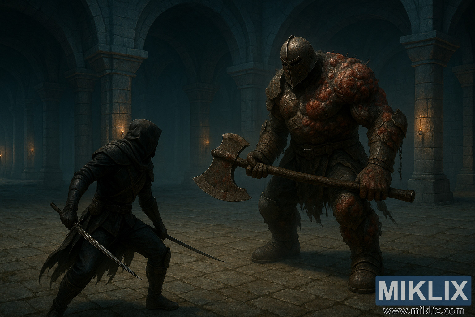 معركة خيالية مظلمة واقعية بين قاتل السكين الأسود ومبارز حارس القبر الفاسد في غرفة سراديب الموتى الكبيرة المضاءة بالمشاعل.