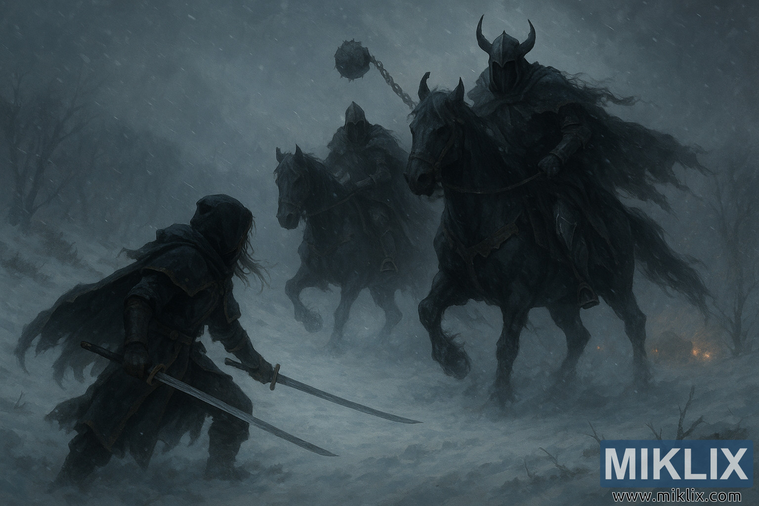 يتخذ التهديد شكل شخصين ضخمين راكبين - فرسان فرسان الليل - يخرجان من العاصفة الثلجية حتمًا. يمتطيان خيولين أسودين ثقيلين، تحرك خطواتهما القوية الثلج تحتهما، تاركتين وراءهما أعمدةً فوضوية من الصقيع. معاطف الخيول داكنة وخشنة، ملطخة ببقع من الصقيع. أنفاسهما تختلط بكثافة في الهواء البارد. الفرسان أنفسهم يرتدون دروعًا مهيبة سوداء كالسخام، مع خوذات عريضة ذات قرون، وعباءات ضخمة ممزقة ترفرف خلفهم بشكل درامي.