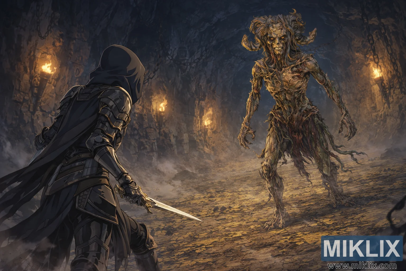 يحيط سجن لامنتر بالشخصيتين في حجرة حجرية خانقة. تنحني جدرانه الصخرية الخشنة نحو الداخل، لتشكل فضاءً أشبه بكهف سجن مُدعّم بسلاسل حديدية ثقيلة تتدلى بشكلٍ مُنذر في الخلفية. تُلقي المشاعل المُثبتة على طول الجدران بقعًا غير متساوية من الضوء الذهبي، في تناقضٍ صارخ مع الظلال العميقة المُلتصقة بزوايا السجن. الأرض غير مستوية ومُغطاة بالغبار والحطام والحجارة المتشققة، مما يُضفي على المكان ملمسًا مميزًا وإحساسًا بالقدم والزوال. يلف ضبابٌ خفيفٌ الهواء، يُخفف من حدة التفاصيل البعيدة ويُعزز الجو الكئيب والمُخيف.