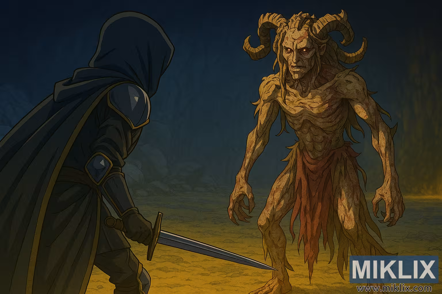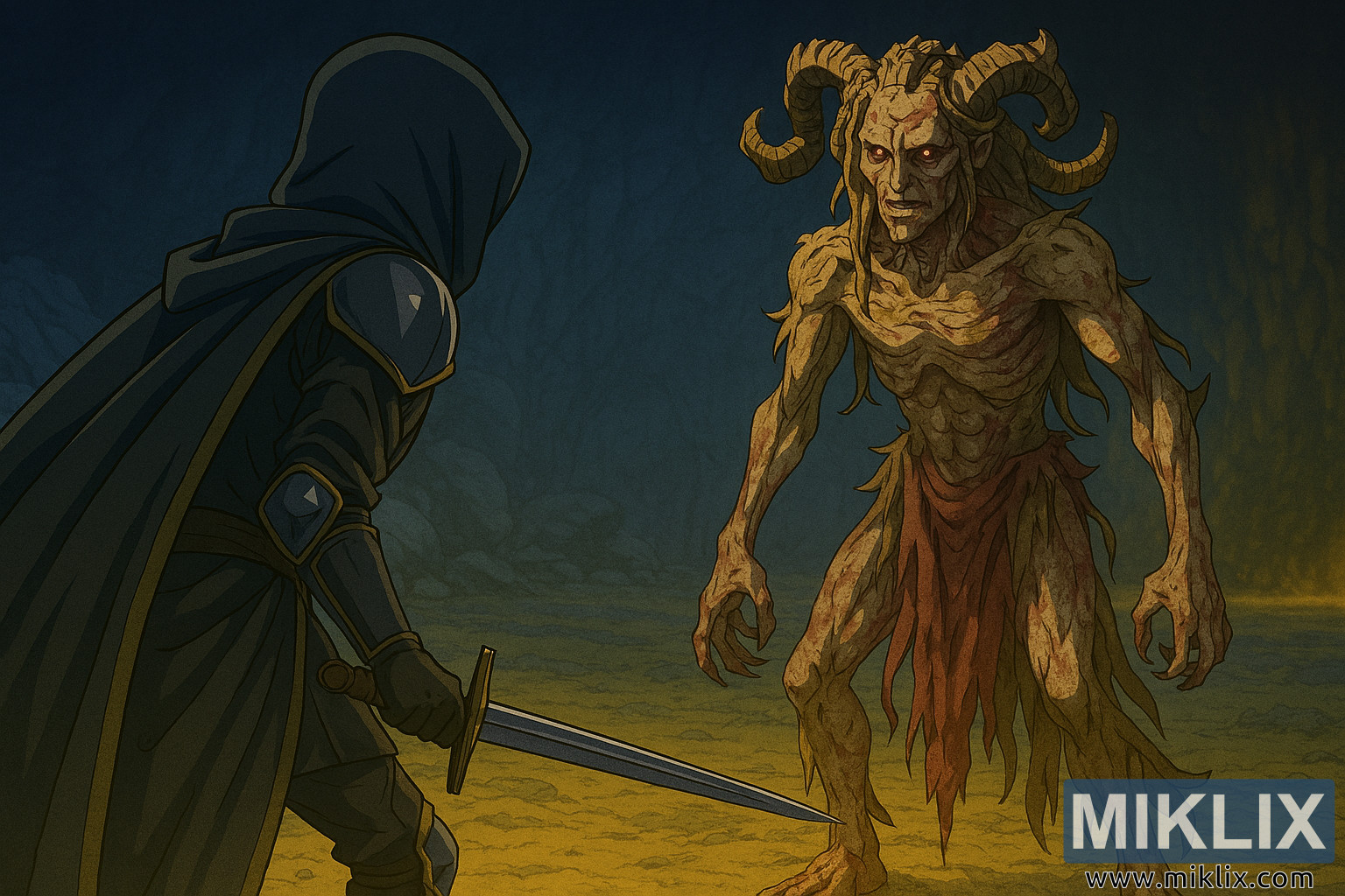 رسمة فنية مستوحاة من الأنمي لشخصية "المشوه" المرتدية درع "السكين الأسود" وهي تواجه زعيم "الرثاء" في لعبة "إلدن رينغ: ظل شجرة الأرض"، قبل لحظات من بدء المعركة.