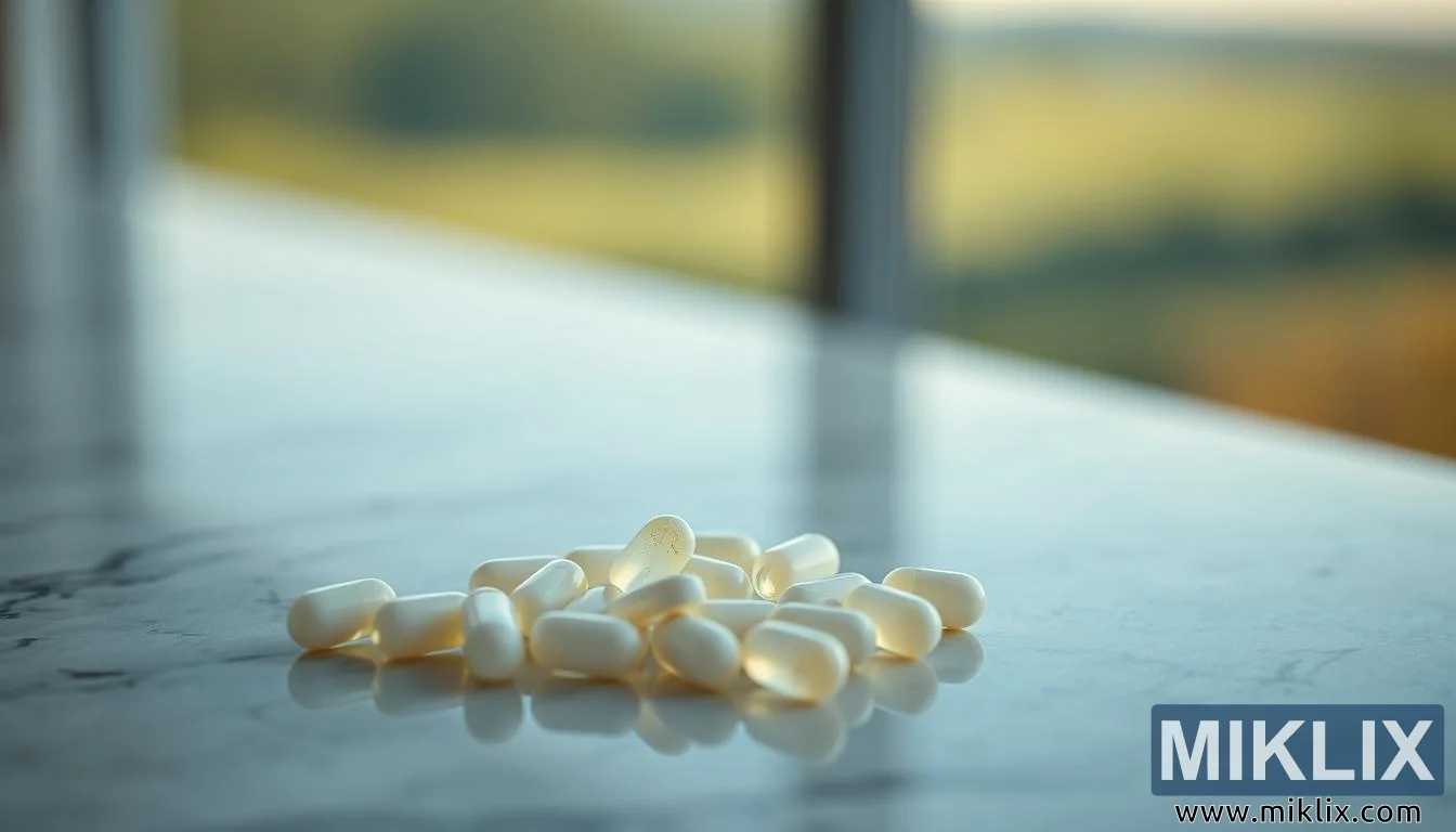 لقطة مقربة هادئة لمكملات L-lysine على سطح محكم مع خلفية هادئة ضبابية، ترمز إلى تأثيراتها المهدئة والمخففة للقلق.