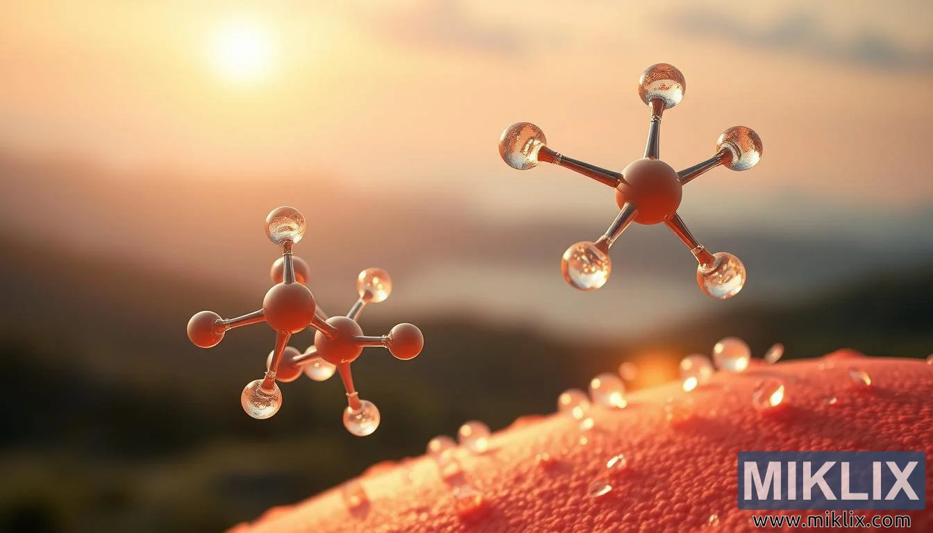 خلف الجزيئات مباشرةً، يكشف الوسط عن لقطة مقربة لجلد الإنسان، في حالة تجدد. سطح كان يومًا ما مُصابًا بالتمزق، يُظهر الآن علامات مبكرة للشفاء، مع تكاثر الخلايا الجديدة وقطرات صغيرة من الرطوبة تتلألأ على نسيجه. يُبرز هذا التمثيل البصري للتجدد وظيفة L-Lysine الأساسية في تخليق الكولاجين، الذي يوفر الدعم الهيكلي لإعادة بناء الجلد والأنسجة الضامة. تُوحي القطرات المنتشرة على سطح الجلد بالحيوية والترطيب، مُستحضرةً التغذية التي تحدث على المستوى الخلوي أثناء عملية الإصلاح. يُضفي الضوء الخفيف على الجلد توهجًا ناعمًا، مُعززًا رسالة مفادها أن الجسم، عند إعطائه العناصر الغذائية المناسبة، لديه قدرة استثنائية على شفاء نفسه. تجعل الصور الكيمياء الحيوية ذات صلة وملهمة في آنٍ واحد، مُحوّلةً العمليات المجردة إلى تقدم ملموس ومرئي.