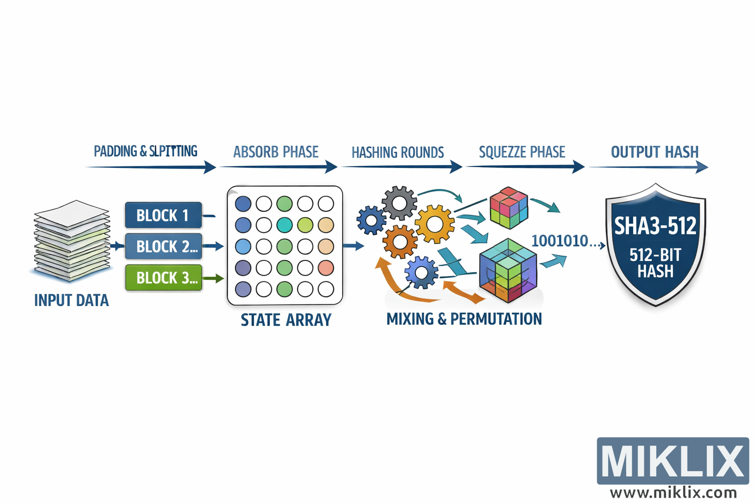 SHA3-512 (خوارزمية التجزئة الآمنة 3 512 بت) هي دالة تجزئة تشفيرية تأخذ مدخلات (أو رسالة) وتنتج مخرجات ثابتة الحجم 512 بت (64 بايت)، والتي يتم تمثيلها عادةً كرقم سداسي عشري مكون من 128 حرفًا.