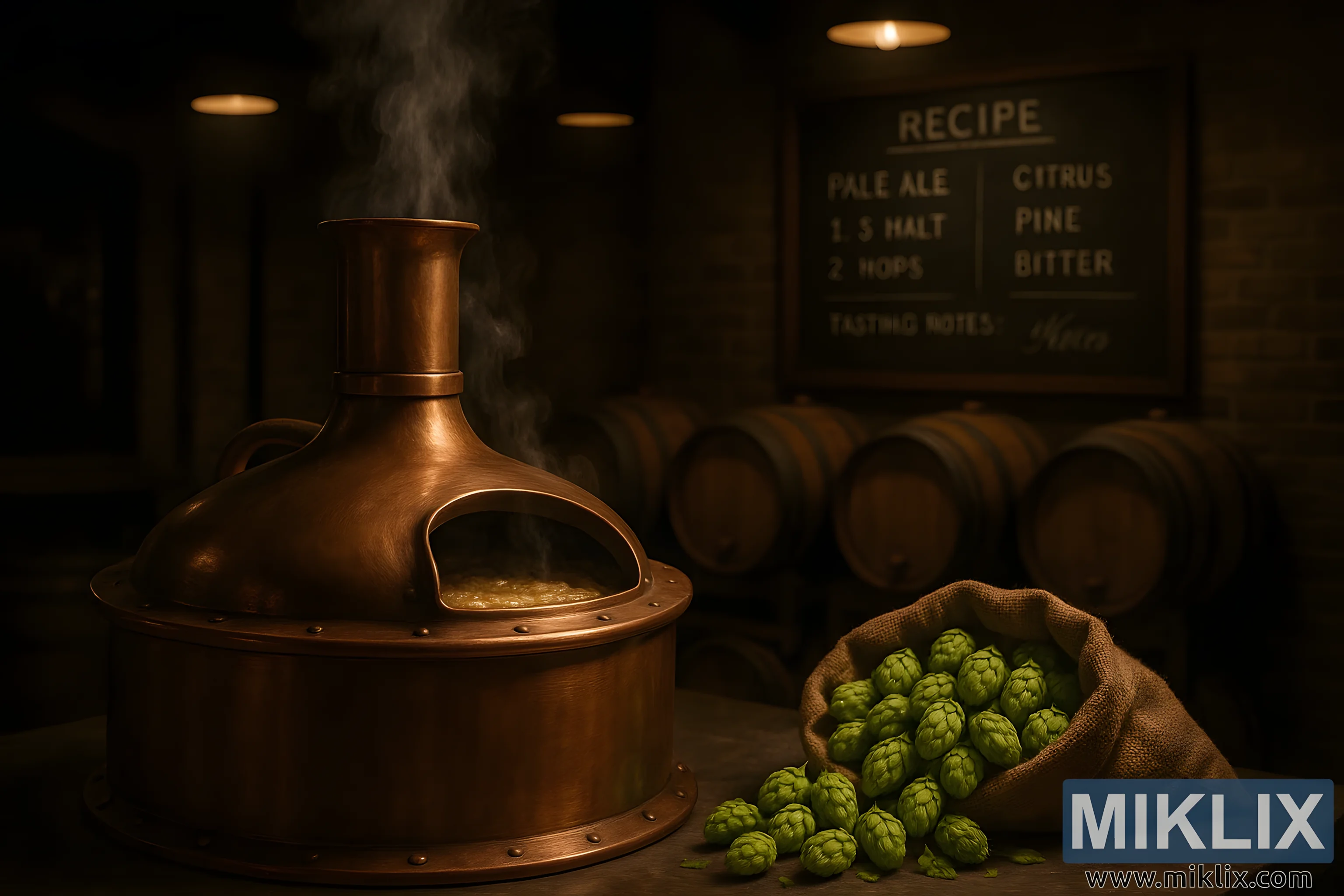 يغلي غلاية نحاسية بجانب قفزات زينيث الطازجة وبراميل البلوط وملاحظات الوصفة، مما يجسد الشغف الحرفي بتخمير البيرة الحرفية.