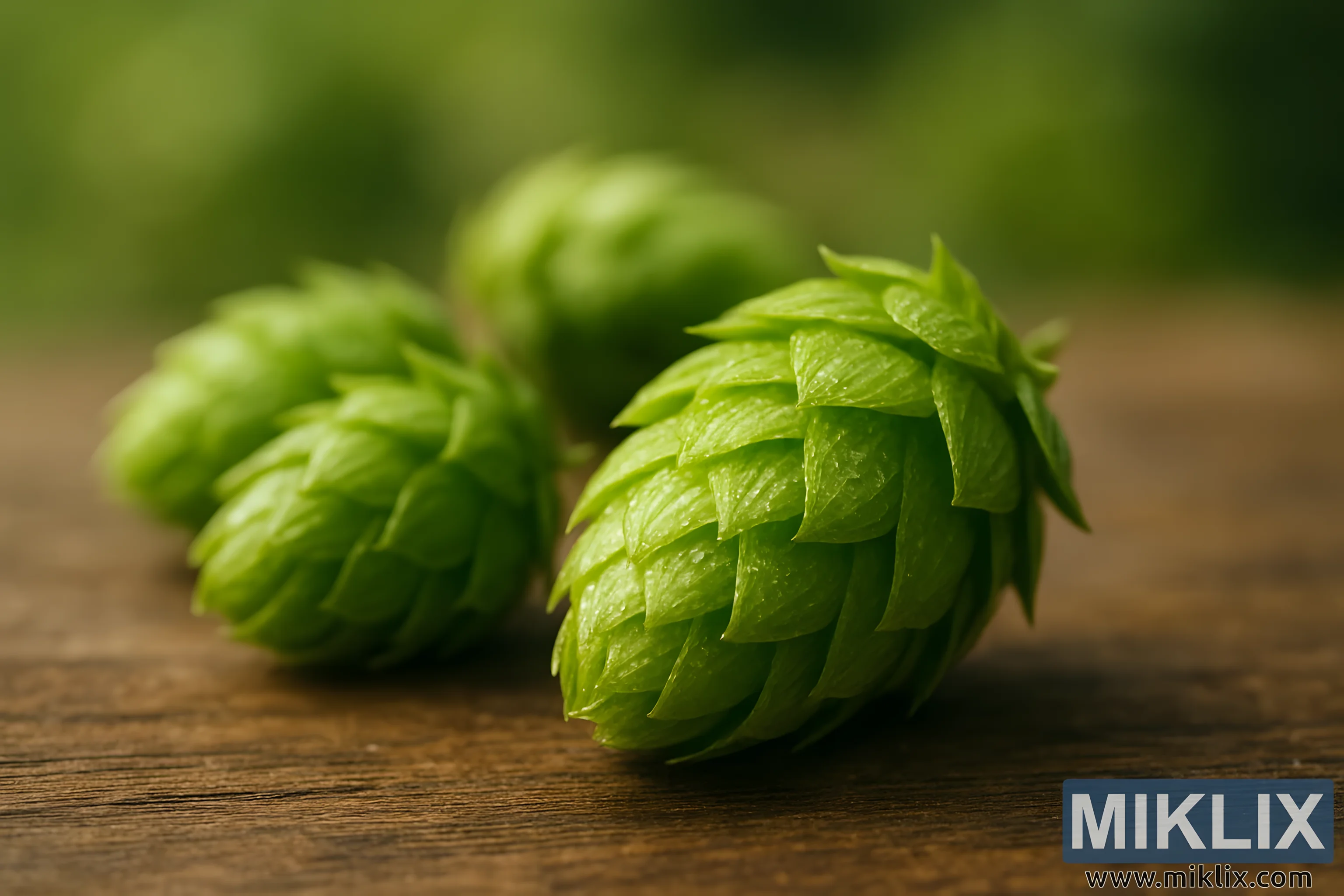 يُضفي السطح الخشبي الذي تستقر عليه المخاريط دفئًا وعمقًا على التركيبة. تُضفي درجاته البنية الغنية وحبيباته الطبيعية توازنًا ريفيًا مع اللون الأخضر الزاهي للقفزات، مُرسِّخًا المشهد في التقاليد والحرفية. يُذكر هذا التجاور المُشاهد بثنائية التخمير: فهو مُتجذر في التراث الزراعي ويرتقي به فنٌّ دقيق. يتلاشى التركيز الناعم للخلفية في خضرة باهتة، مُستحضرًا الحقول التي زُرعت فيها هذه المخاريط وحُصدت، مع ترك القفزات في المقدمة كنجومٍ بارزة في الإطار. تُعزز هذه الخلفية الضبابية حميمية اللقطة المُقرَّبة، داعيةً المُشاهد إلى التفكير ليس فقط في شكل القفزات، ولكن أيضًا فيما تُمثله - الرحلة الحسية التي تُطلقها بمجرد دخولها في عملية التخمير.