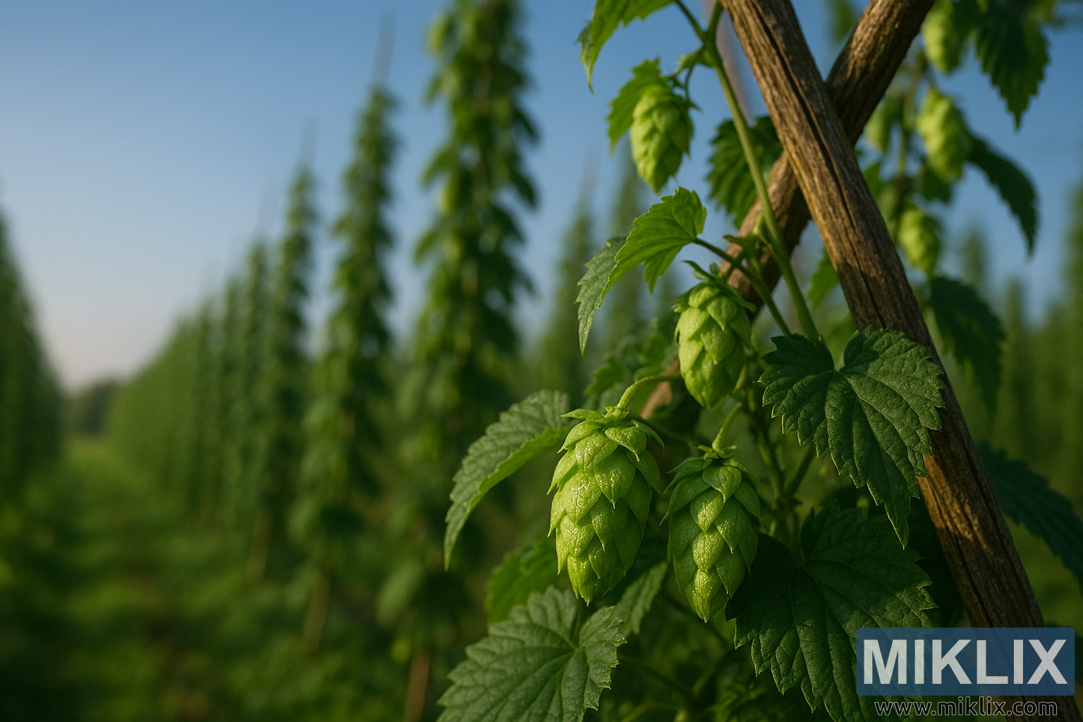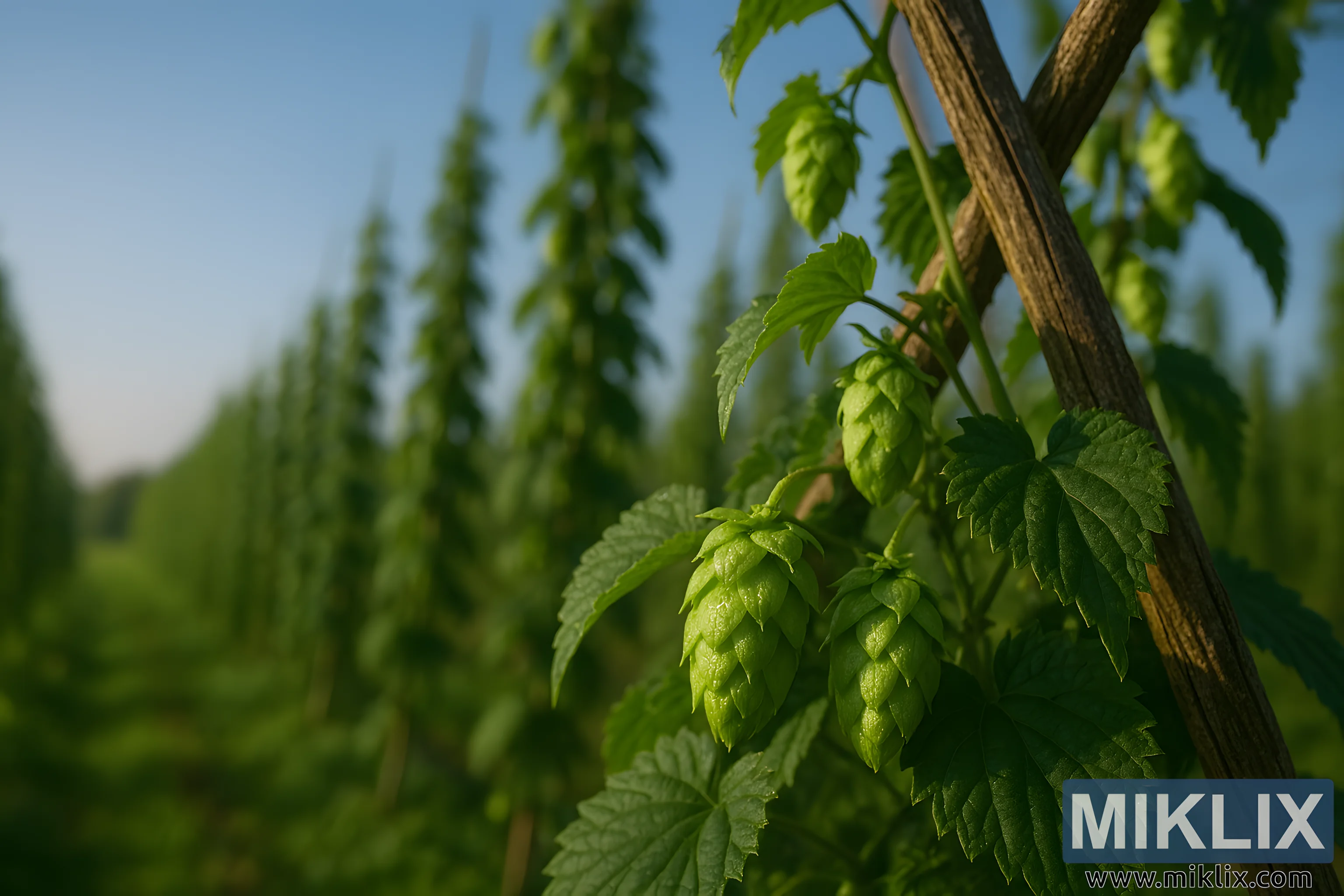 تستحضر هذه الصورة إحساسًا بالسكينة والتقاليد والفخر الزراعي. إنها تحتفي بدور نبات الجنجل "هيرسبروكير إي" في صناعة البيرة، مُبرزةً جماله وأهميته من خلال تفاصيل دقيقة وإضاءة طبيعية. يضمن عمق المجال الضحل تركيز انتباه المشاهد على مخاريط الجنجل في المقدمة، بينما توفر الخلفية السياق والجو العام.