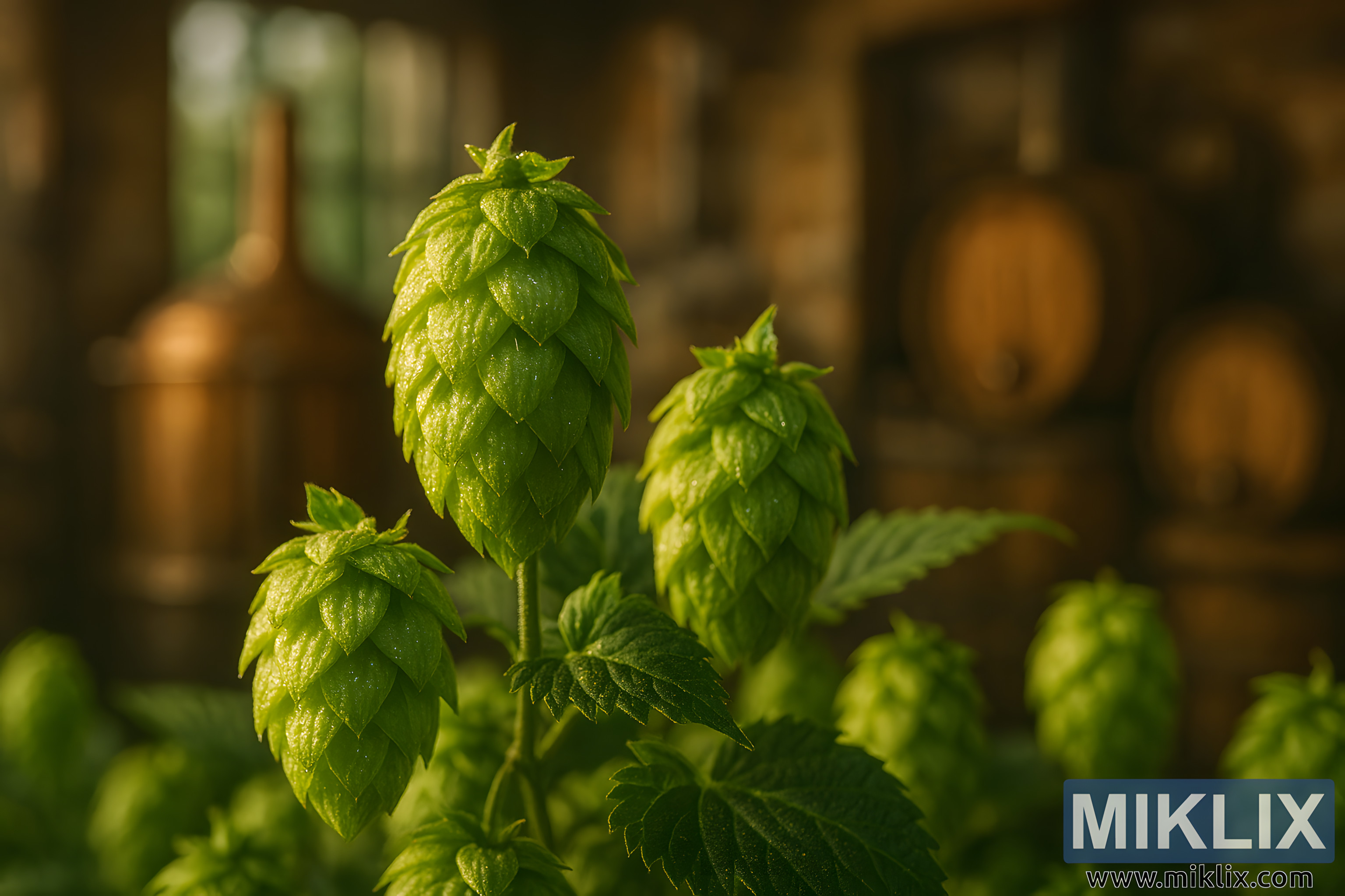 في الخلفية الضبابية الناعمة، تكشف الصورة عن مشهد مصنع جعة ريفي. تقف على اليسار غلاية نحاسية كبيرة ذات قبة ومدخنة رفيعة، تتناغم ألوانها المعدنية الدافئة مع الضوء الذهبي. على اليمين، تتراص عدة براميل خشبية أفقياً، بالكاد تُرى أشكالها الدائرية وحلقاتها المعدنية الداكنة من خلال تأثير البوكيه. عناصر الخلفية غير واضحة عمداً، مما يضفي عمقاً على المشهد دون أن يصرف الانتباه عن نبات الجنجل.