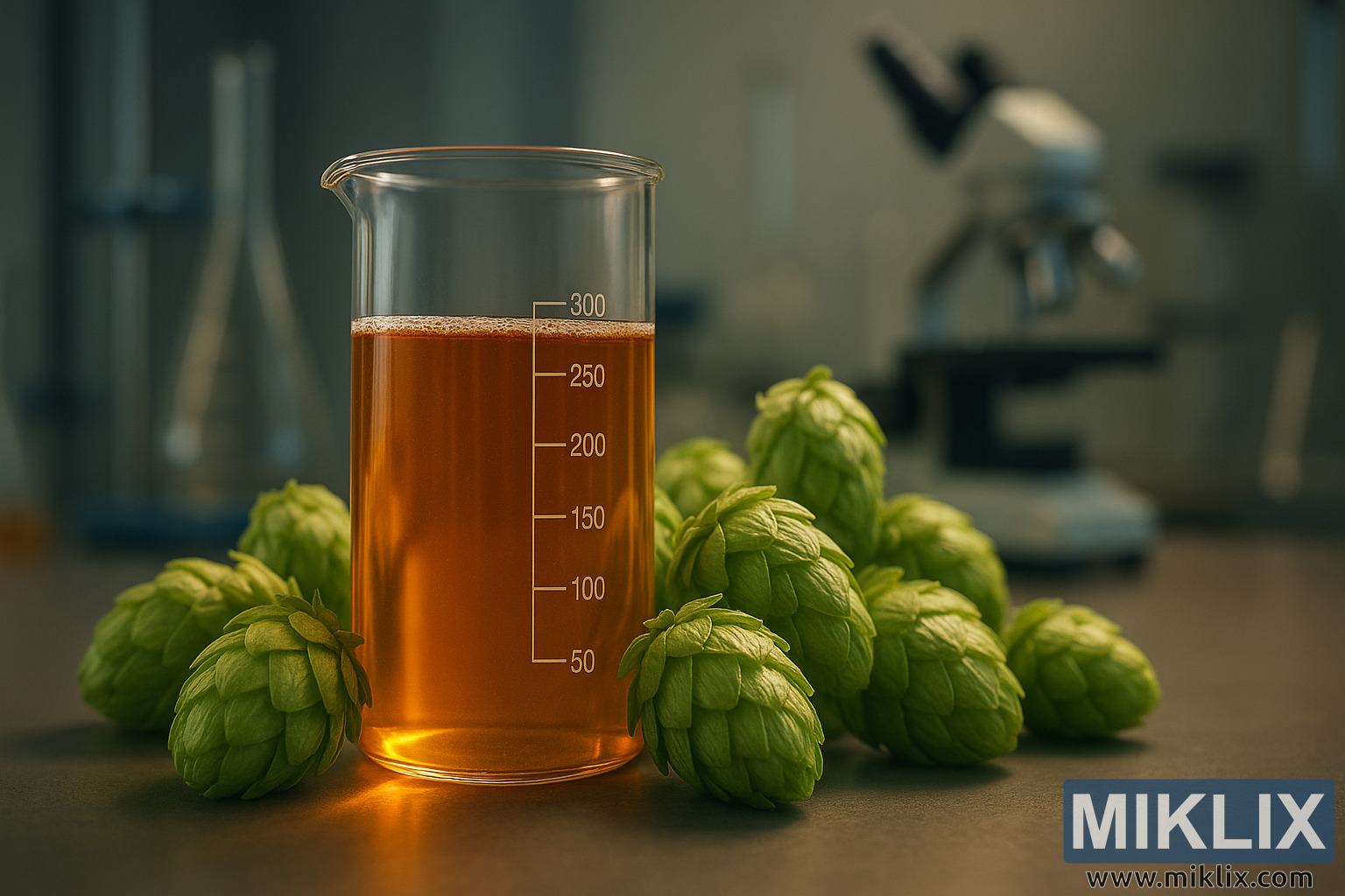 مشهد مختبري عالي التفاصيل يضم نباتات القفزات من نيوبورت، وكأسًا من خلاصة العنبر الذهبي، ومعدات علمية، مع تسليط الضوء على تحليل نباتات القفزات ودقة التخمير.
