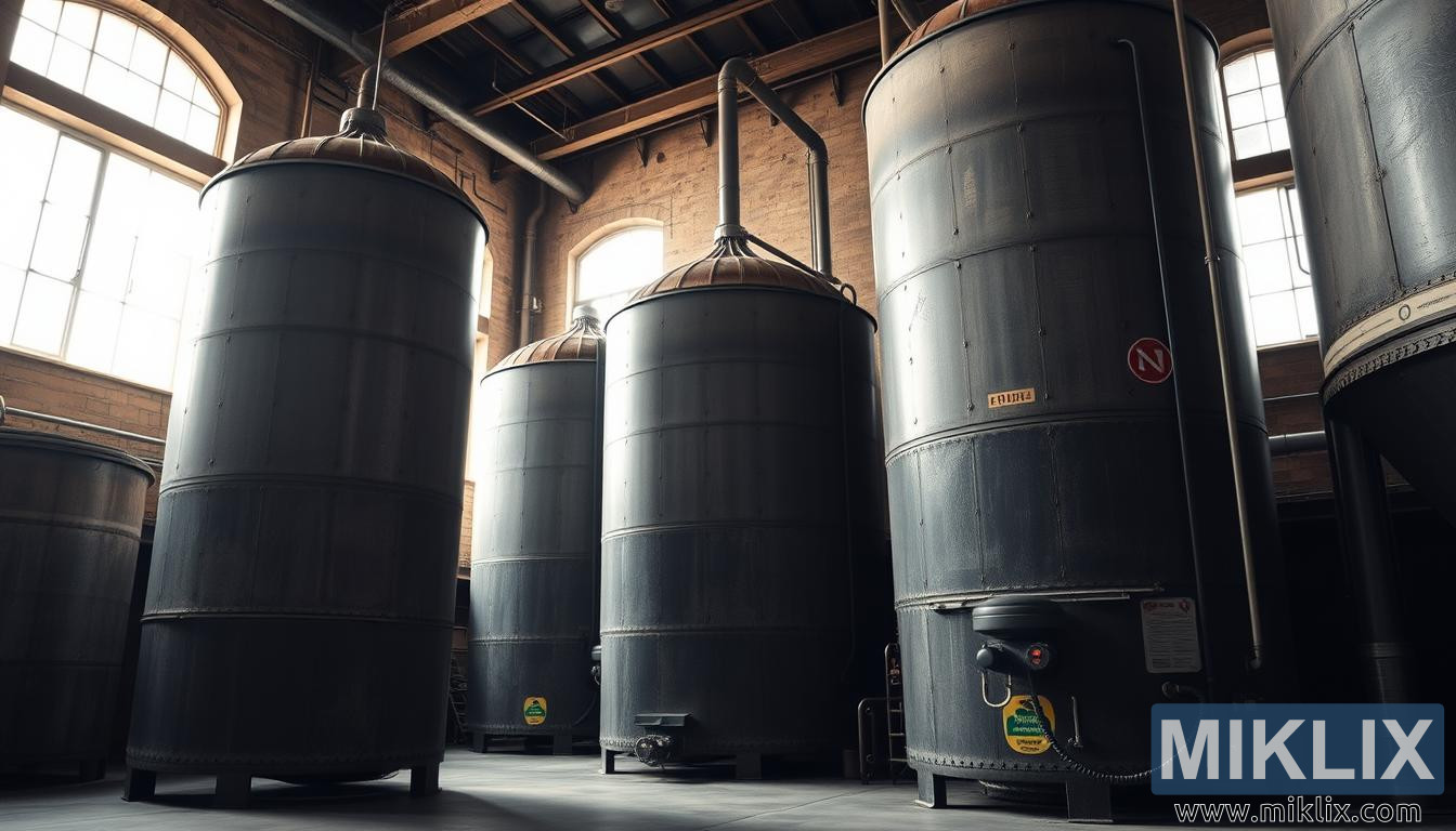 تصميم داخلي جيد الإضاءة لمصنع الجعة مع صوامع معدنية قديمة الطراز وأنابيب ومعدات تخمير، مما يسلط الضوء على النظام والعناية في تخزين الشعير ومعالجته.