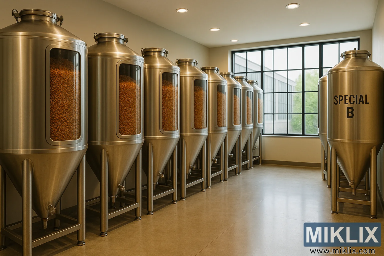 في منشأة تخمير أنيقة ومصممة بعناية، تكشف الصورة عن غرفة تخزين واسعة تجمع بين الكفاءة الصناعية وأجواء دافئة وجذابة. يهيمن على الغرفة صف من صوامع الفولاذ المقاوم للصدأ الشاهقة، كل منها مصان بعناية فائقة ويتألق تحت مزيج من ضوء النهار الطبيعي والإضاءة العلوية الناعمة المحيطة. هذه الصوامع ليست مجرد أوعية عملية، بل هي واجهات لعرض المكونات الأساسية لعملية التخمير. يتميز كل منها بلوحة عرض شفافة، تظهر من خلالها بوضوح حبوب الشعير الغنية بلون العنبر من شعير Special B. تتألق الحبوب بلمعان رقيق، وتتراوح درجات ألوانها العميقة من البني الذهبي إلى اللون البني المحمر، مما يُلمح إلى نكهات الكراميل القوية والزبيب التي ستضفيها على البيرة.