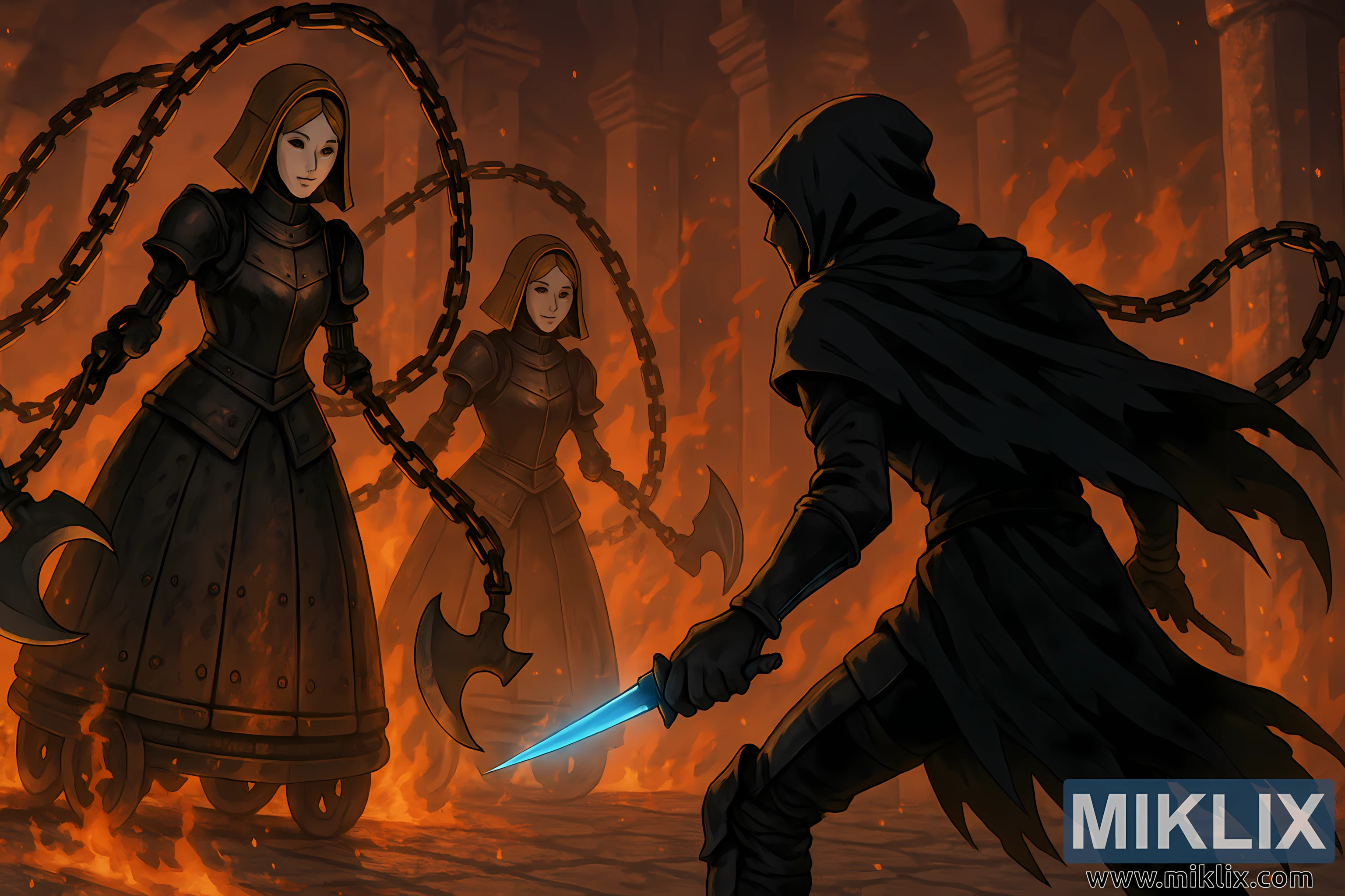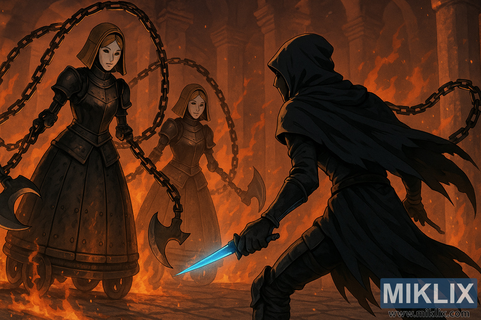 Təkərli dəmir qız bədənləri və zəncirlənmiş balta qolları ilə təsvir edilmiş, alovlu zalda iki qaçıran bakirə ilə döyüşən Qara Bıçaqlı zirehin anime tərzində təsviri.