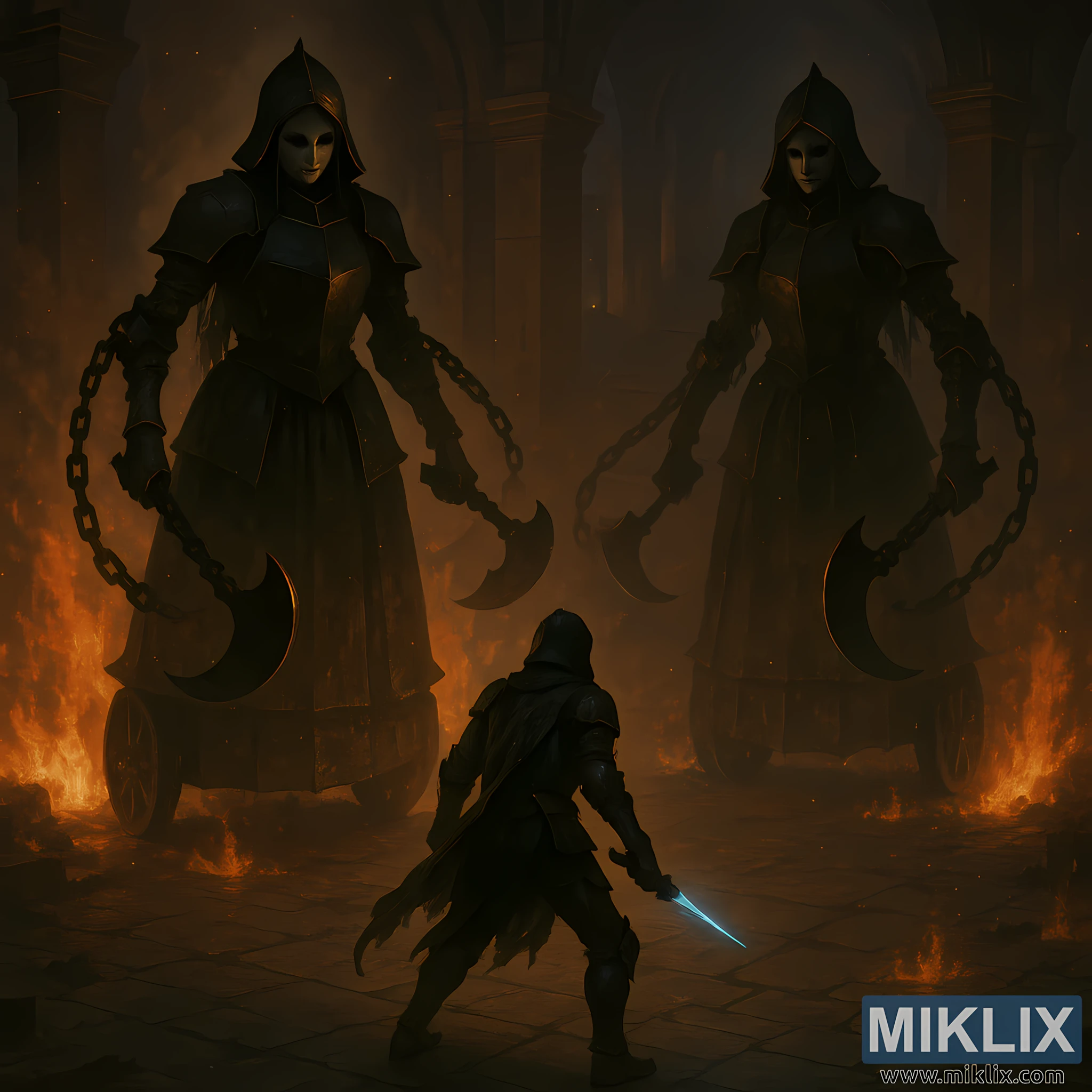 Uzun və ağır zəncirlər çiyinlərindən uzanır, ilanlar kimi əyri şəkildə bükülür. İşıq indi hər bir dəmir halqaya düşür, onlara ümumi siluet əvəzinə ağırlıq və təhlükə yaradır. Onların qəssablıq üçün düzəldilmiş aypara kimi əyilmiş balta bıçaqları kəhrəba atəşinin tutqun əksi ilə parlayırdı. Onlar yellənməyə hazır olan hündürlükdə dincəlirlər - və bu geri çəkilmiş mövqedən onların vura bildikləri qövs birdən aydın, nəhəng, demək olar ki, kinoya çevrilir. Yaxınlıqdakı Virgin irəli əyilir, zəncirləri bir qədər qaldırılır, ikincisi isə arxada qalır, təkərlər bərkidilir və hərəkətsiz qalır və bu, iki-bir-birə qarşı koordinasiyalı irəliləmə hissi verir.